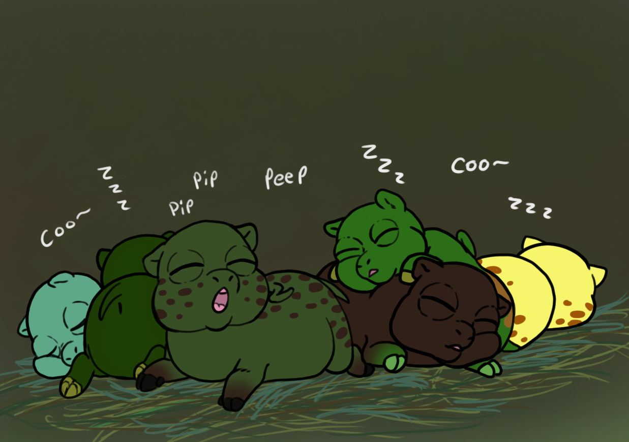 Once the coast is clear, she makes sure her offspring are deep in their slumber before making her move. She makes sure to not linger outside the nest for long, acting disinterested in the thorny brush to keep any unseen eyes from suspecting it’s the location of her home, and more importantly, her young. These brief trips outside the nest are spent hunting, looking for any easy prey or scavenge-able remains of already deceased fluffies and animals. She never drags back too much, in case the smell of blood attracts bigger predators.