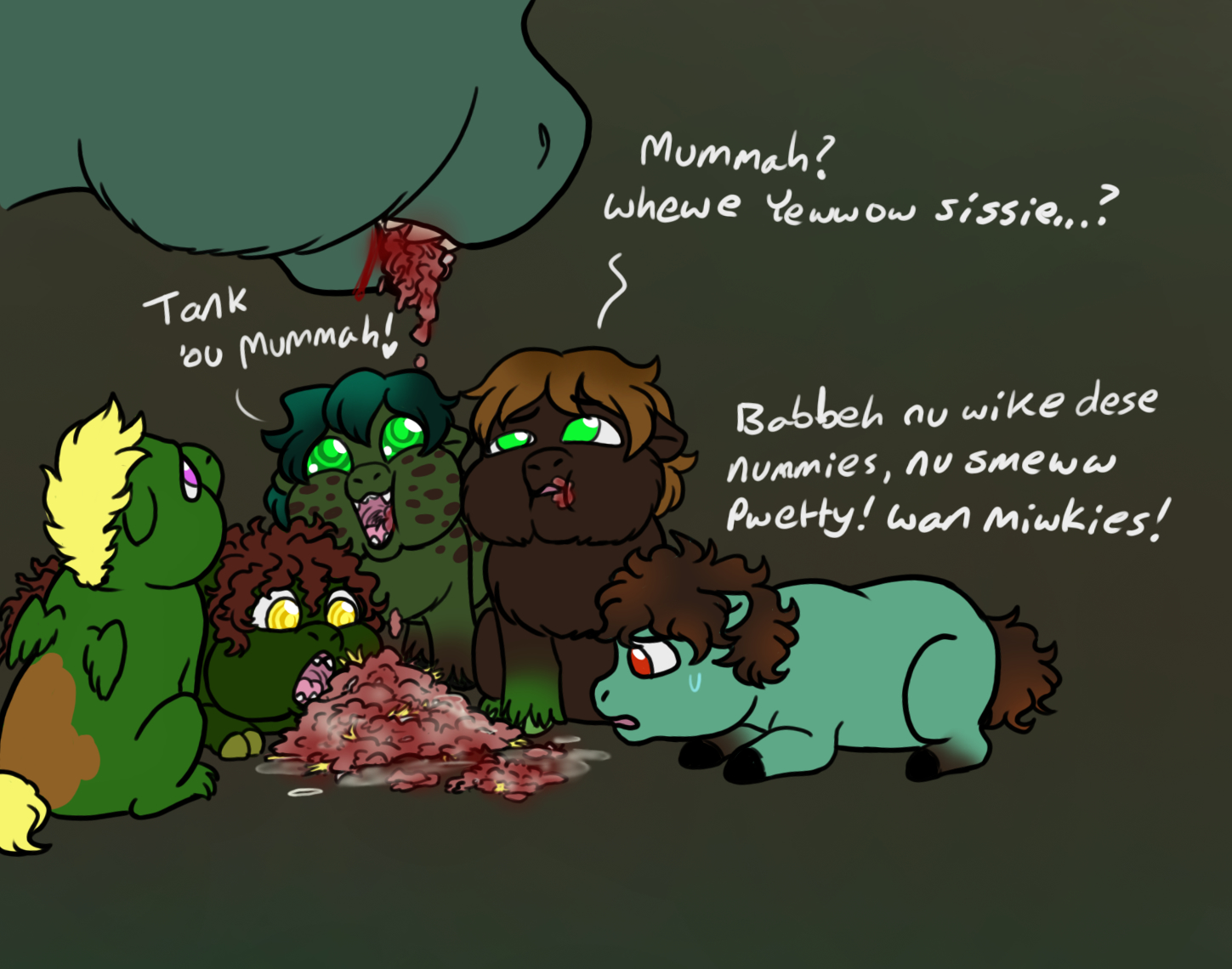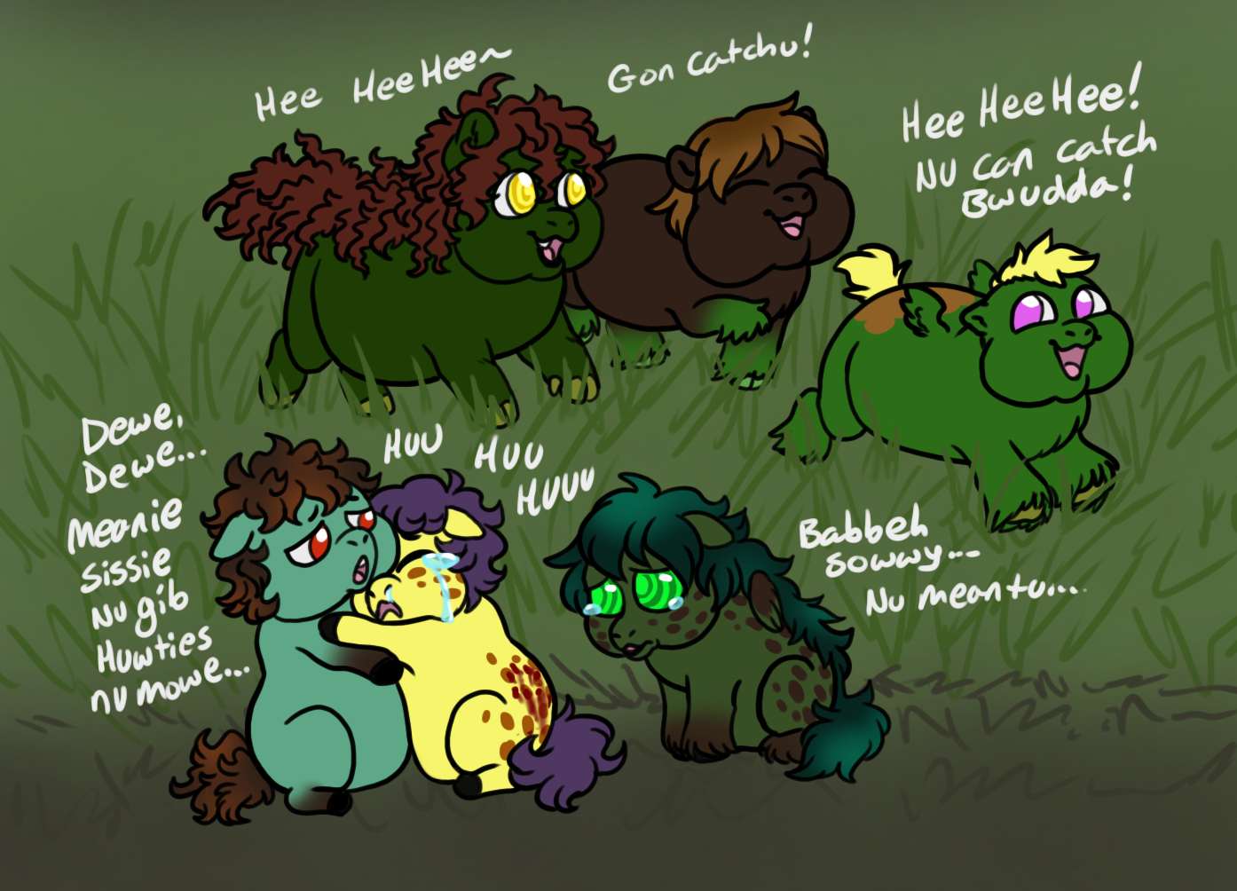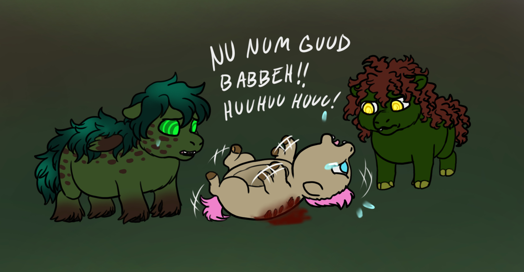 “Da outsie nu cawe if ‘ou am guud fwuffy ow bad fwuffy. It nu cawe fow huggies ow wub. Fwuffies am fow nummies. If ‘ou nu num oddah fwuffies, den ‘ou get wostest hungies an’ tummeh huwties, an’ fowevah sweepies. ‘Ou am big fwuffies nao, an’ nee’ be stwong.” Their mother explains, lightly scooting the injured bowl fluffy foal towards them. “Nao gib da nummie fwuffy fowevah sweepies an’ num it.”