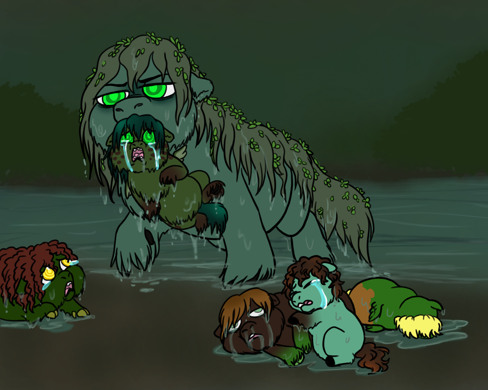 The lesson is harsh and despite her instructions on him holding his breath, he drowns within the first 15 seconds. She drops his body on the bank, disappointed at his performance. The foals, not understanding the concept of death try to resuscitate him with hugs, begging him to breathe. The process is repeated again and again with the remaining three foals. The second colt, a brown pegasus, drowns. The remaining kelpie and non-kelpie sisters somehow manage to survive.