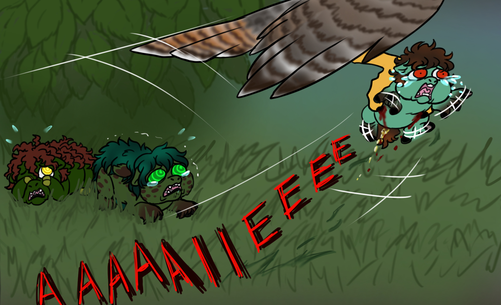 In a blink, a dark coloured blur swept by. Out of sheer instinct, the fillies dropped low to the ground, staying still in hopes of not being seen. The teal blue filly was no longer there. Following the direction of her screams, the kelpie sisters watched in horror as their sister was carried away by a large bird. It’s razor sharp talons tearing into the flesh of her soft belly as they went up, up, up… Over the trees, never to be seen again. Crying softly with tails tucked between their legs, the two scurried back to the safety of their nest. Their mother met their gaze, her expression filled with disappointment and heartache. Shaking her head lightly, she sniffled and gestured to the remains of their fluffy brothers.