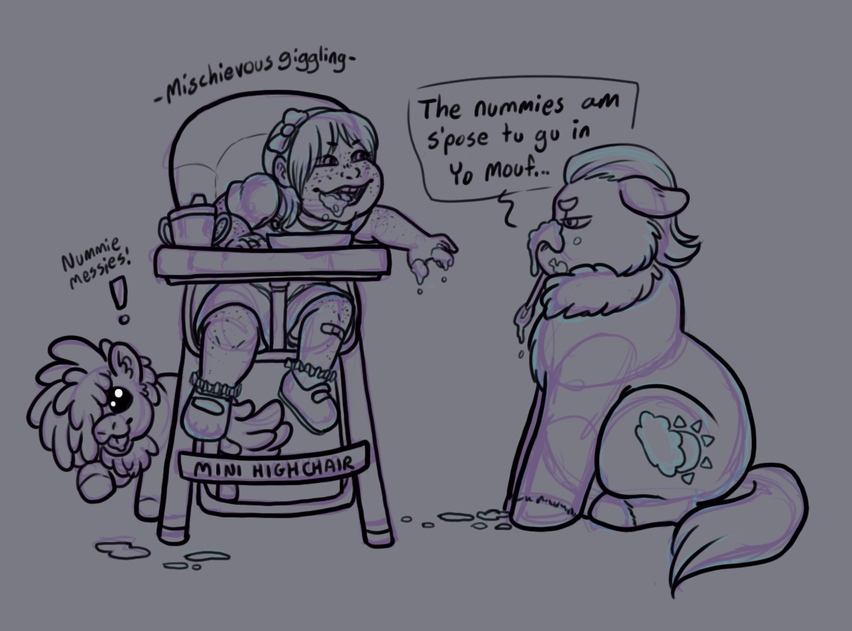 Although my current situation is still royally fucked, I’m happy to say that I’m no longer sick from the sinus infection! The only fluffy content I can safely draw is hugbox material, so any current stories or abuse art I had in the works will be on hold for the time being, Raising Rainbow included.
