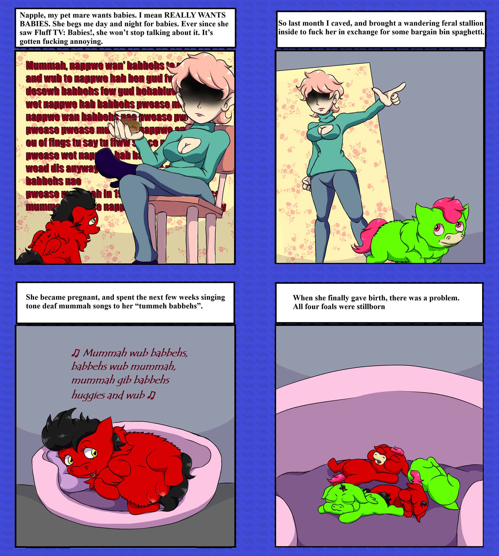 What’s the problem? Dumb bitch wanted babies, she got babies. Maybe if she was a good fluffy she would have gotten live babies. But she wasn’t and she didn’t. Just have to remind her of that every time she asks from now on. That should cure her of her obsession. Well that and a healthy beating when she gets too lippy for her own good.