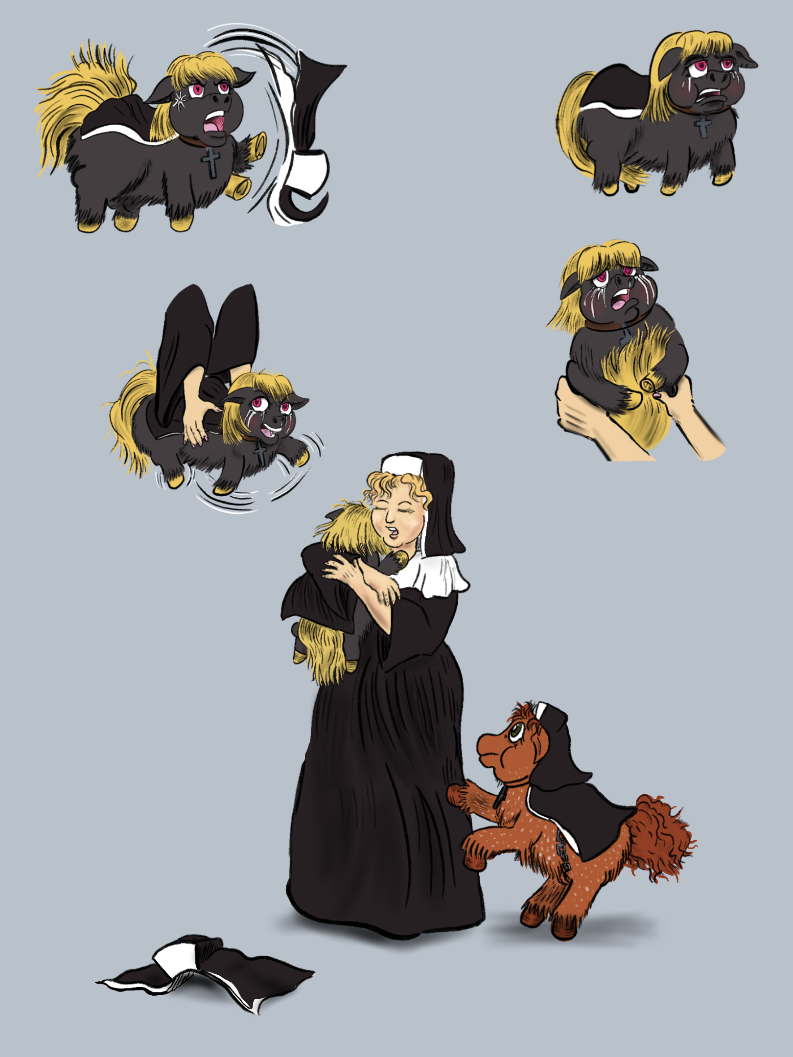 “PUT BON-NEH DOWNSIES! BON-NEH NU AM SCAWEDIES! NU AM-… s-scawedies.” the little mare gritted and snorted, looking around with frantic and wetted eyes as she began thumping her soft pseudo-hooves against the nun’s torso. She struggled to free herself. At the final verbalisation, the misery slipped.