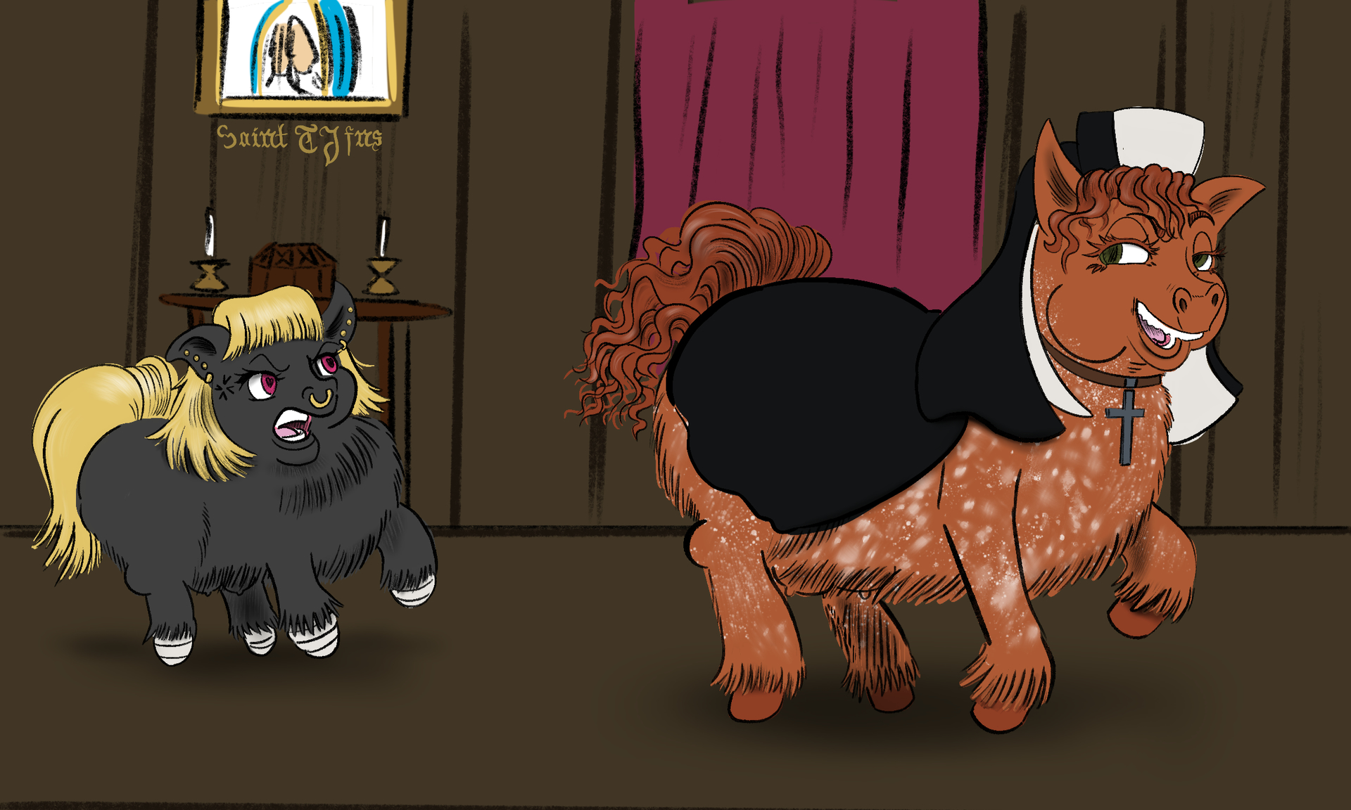 “Sister Jezebel!” she barked, “This whorish display of vulgarity is beyond disappointment, it is sacrilege; but of course, you already knew this, didn’t you?” she sneered in an accent unlike anything that Bonnie had ever heard before, but of course, the socially isolated mare would have no reference for Italian, save for a few of the designer brands that her ex-owner loved so dearly.