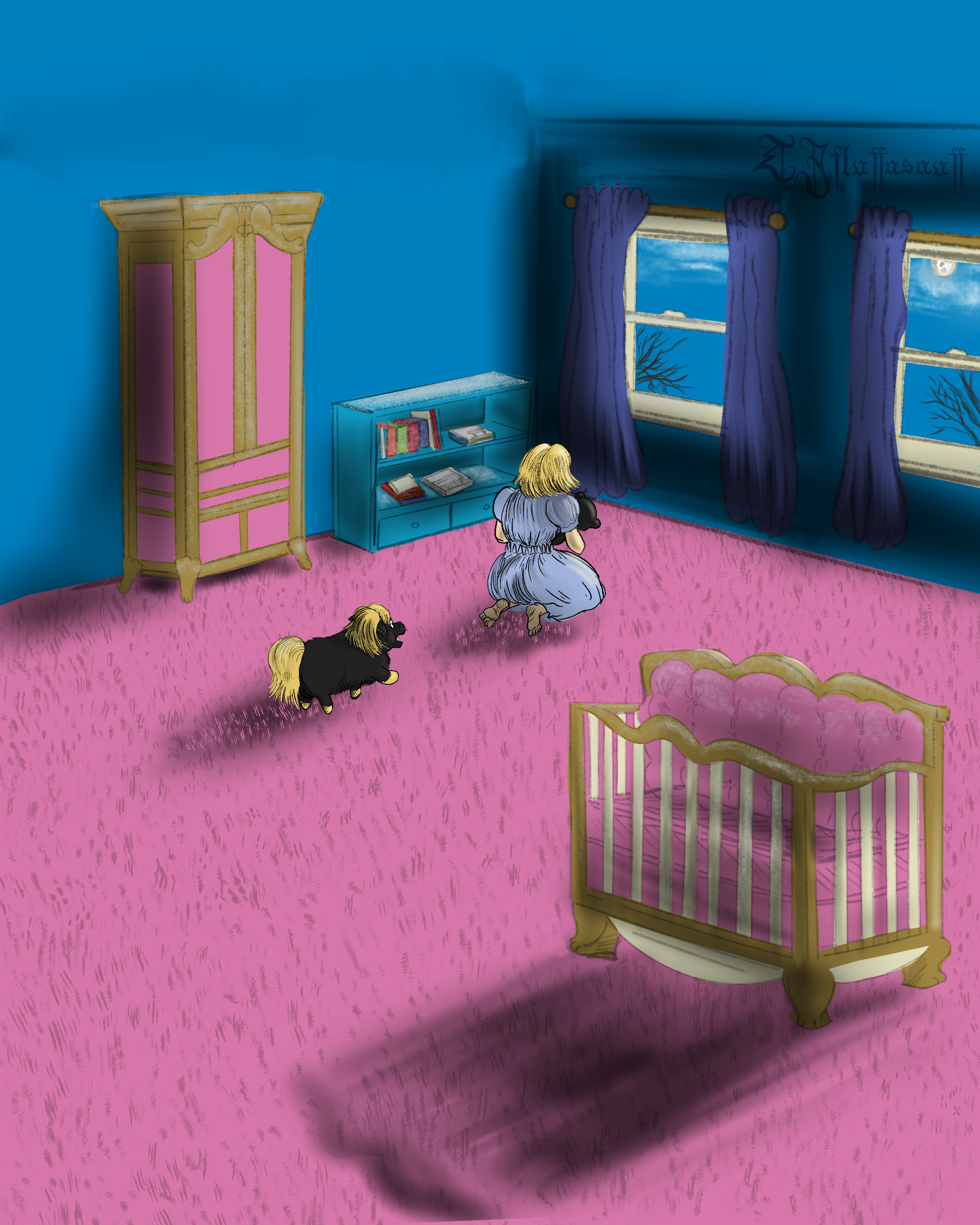 With Bonnie’s litter all perfectly named, she found herself with nothing more to do. She began wandering the ancient room: worn tapestries, old cloth, a dusty rug in the center and a small bench by the stainglass window.
