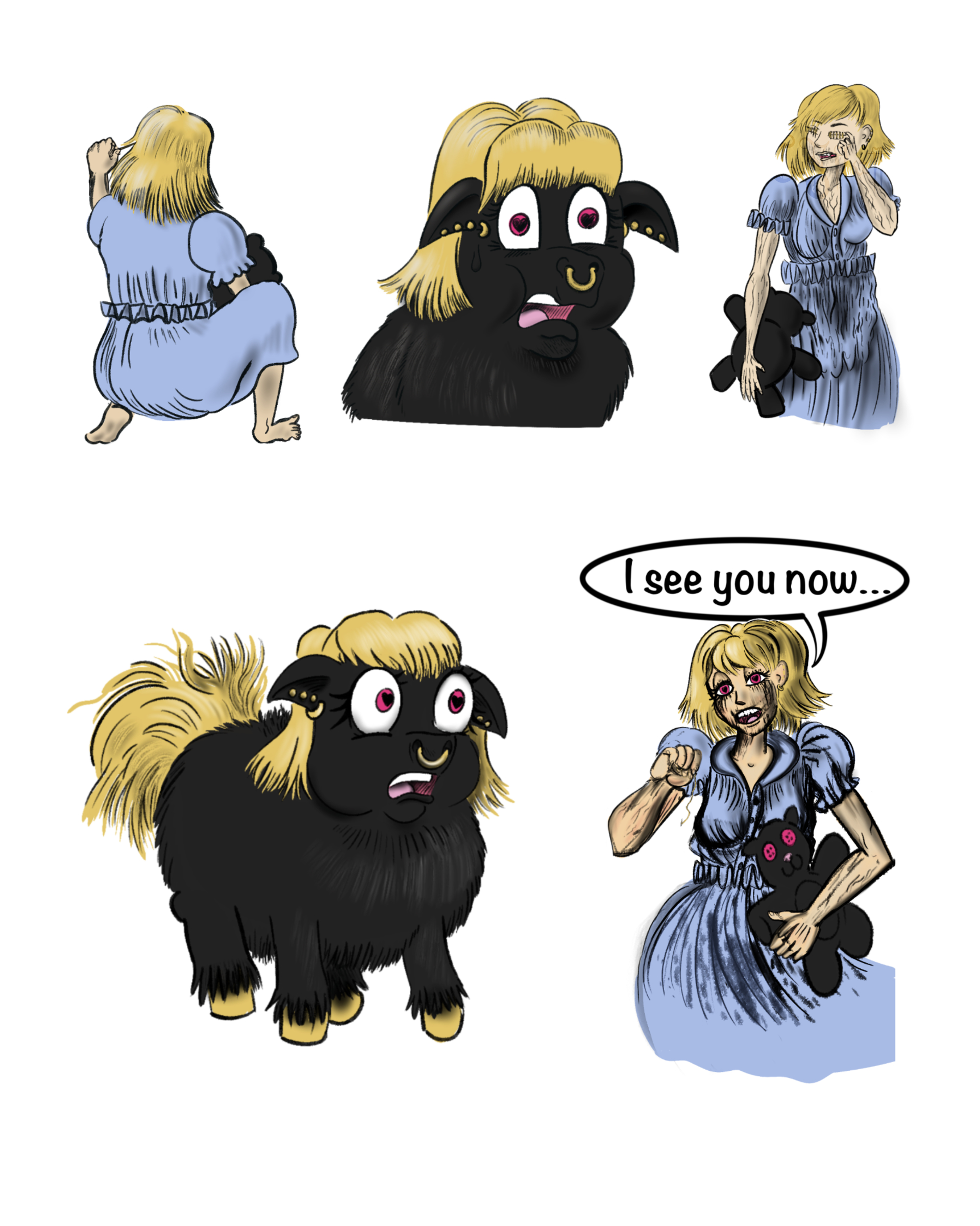 “Pweas mummah sup-ee-wee-ah, nu be angwies wid Jezebew.” the fuckffie begged as she shrank at the foreign tongue, compacting her form until she nearly matched Bonnie in height. “Id nu am Jezebew fawt!” she squeaked, “Nu am sinnew, nu am, NU AM!” she added as she slowly backed away from the black garbed figure.