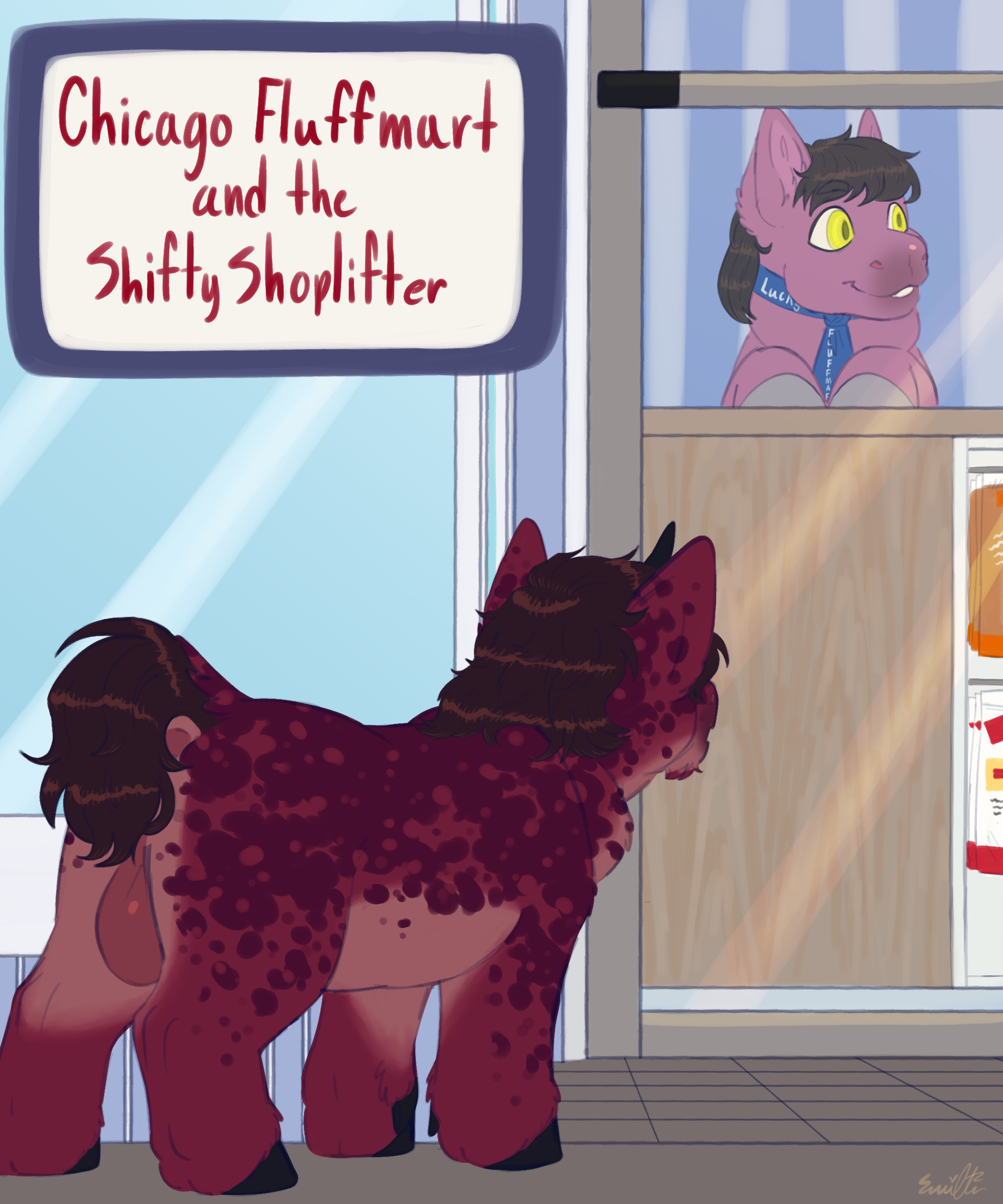 A lanky, dark red unicorn just past the verge of stallionhood sat hunkered below a car parked across from the quiet little store he’d been watching for quite a few days now, studying the oceans of fluffy themed merchandise that filled its interior. His mismatched eyes roamed across what hints of the store he could catch past the glass door as it swung open for a heavy set blonde and her young boy who shook and jostled her arm with every excited bounce. Fellow could hear the kid’s barely contained excitement about what an awesome fluffy he was going to get even from his spot across the street.