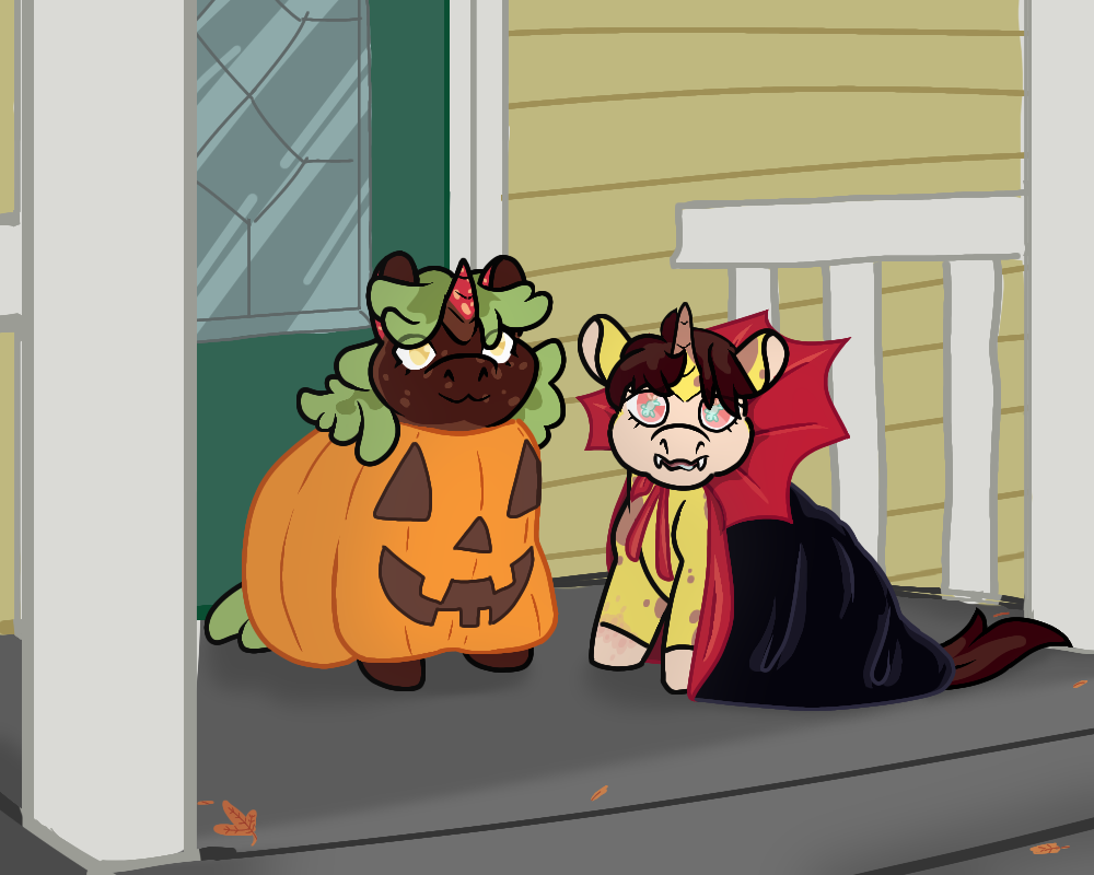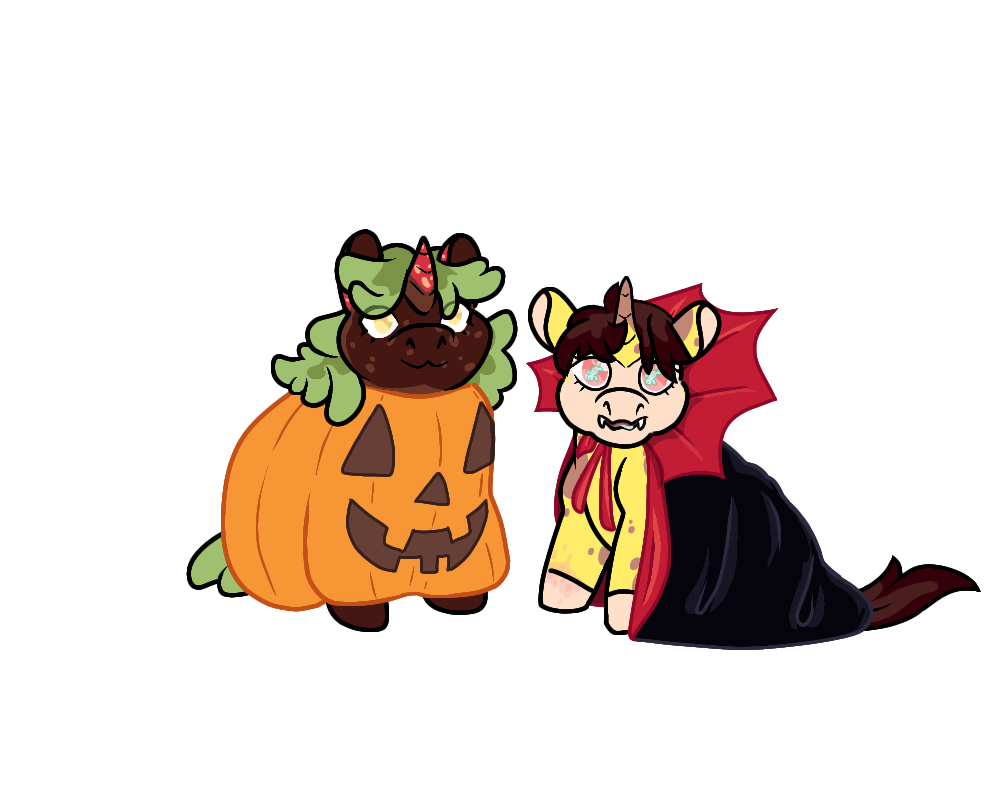 Here’s Chocoberry and Nibbles enjoying their first halloween at their forever home. Nibbles is only looking at the camera because theres a feral foal waiting for her as a treat.