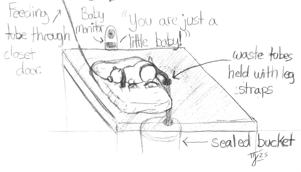 There’s a rubber band around Pixie’s mouth to keep the food tube in place and keep her quiet.