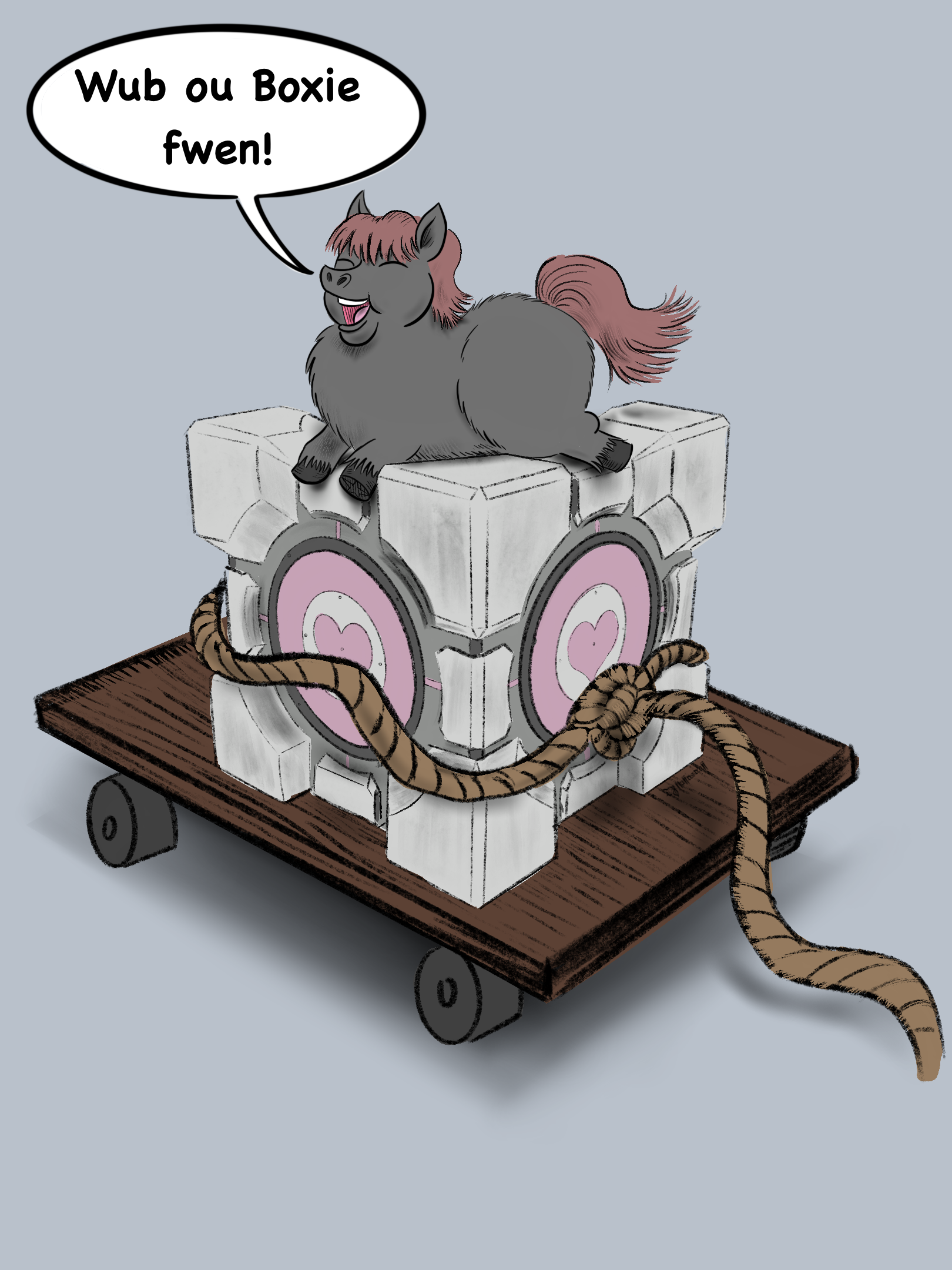 Fan art of @Julie OC Grayson and the companion cube. Both from a Portal crossover Story called Fluffy and boxie friend.