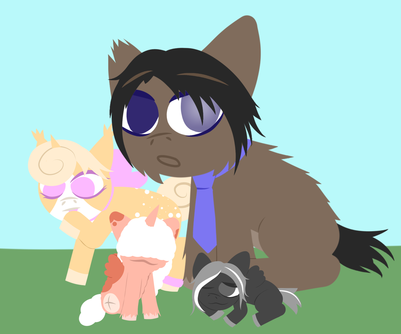 Vintage (formerly Lucky) is a female baby pegasus. She was found on “mummeh”s doorstep one day, and no one really knows where she came from, though that fluffy lab a couple blocks down shutting down probably doesn’t have anything to do with it. She’s very clingy to both “mummeh” and Mister Spyglass, as she’s never known any other caregiver. Her voice is underdeveloped, so she still chirps despite being weaned. When she’s not with her caregivers, she does tend to shut down, not knowing what to do. [She is the black fluffy]