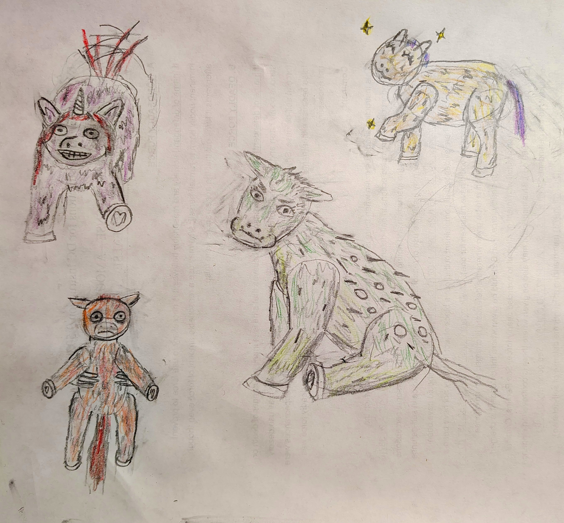 Some quick mechanical and colored pencil sketches of named fluffies from my written works.