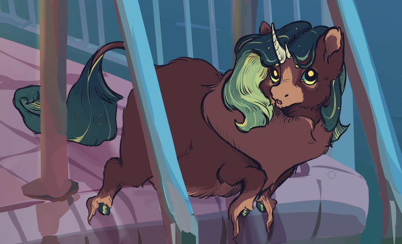 Ooo, very pretty! I agree with Squeaky on the perspective being off. The back hoof looks to be on a similar plane to the front hooves which makes it look like the fluffy’s standing at a rather odd angle. Did you draw the background and fluffy separately? That can sometimes cause a piece to look funny.