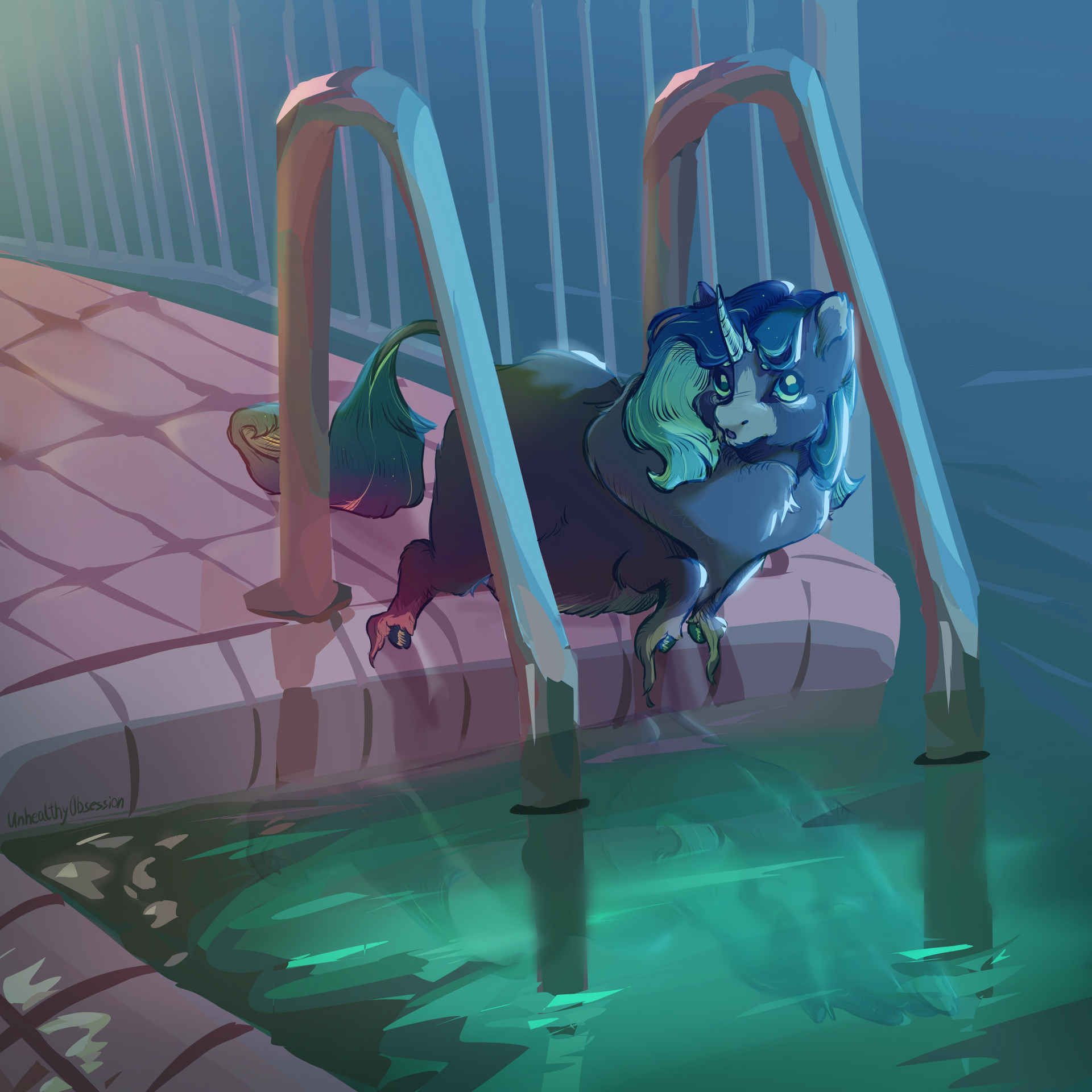 This looks beautiful! Love the lighting and painterly feel, it’s so good. But, from the perspective, it looks like that fluffy’s in the process of jumping into the water…?