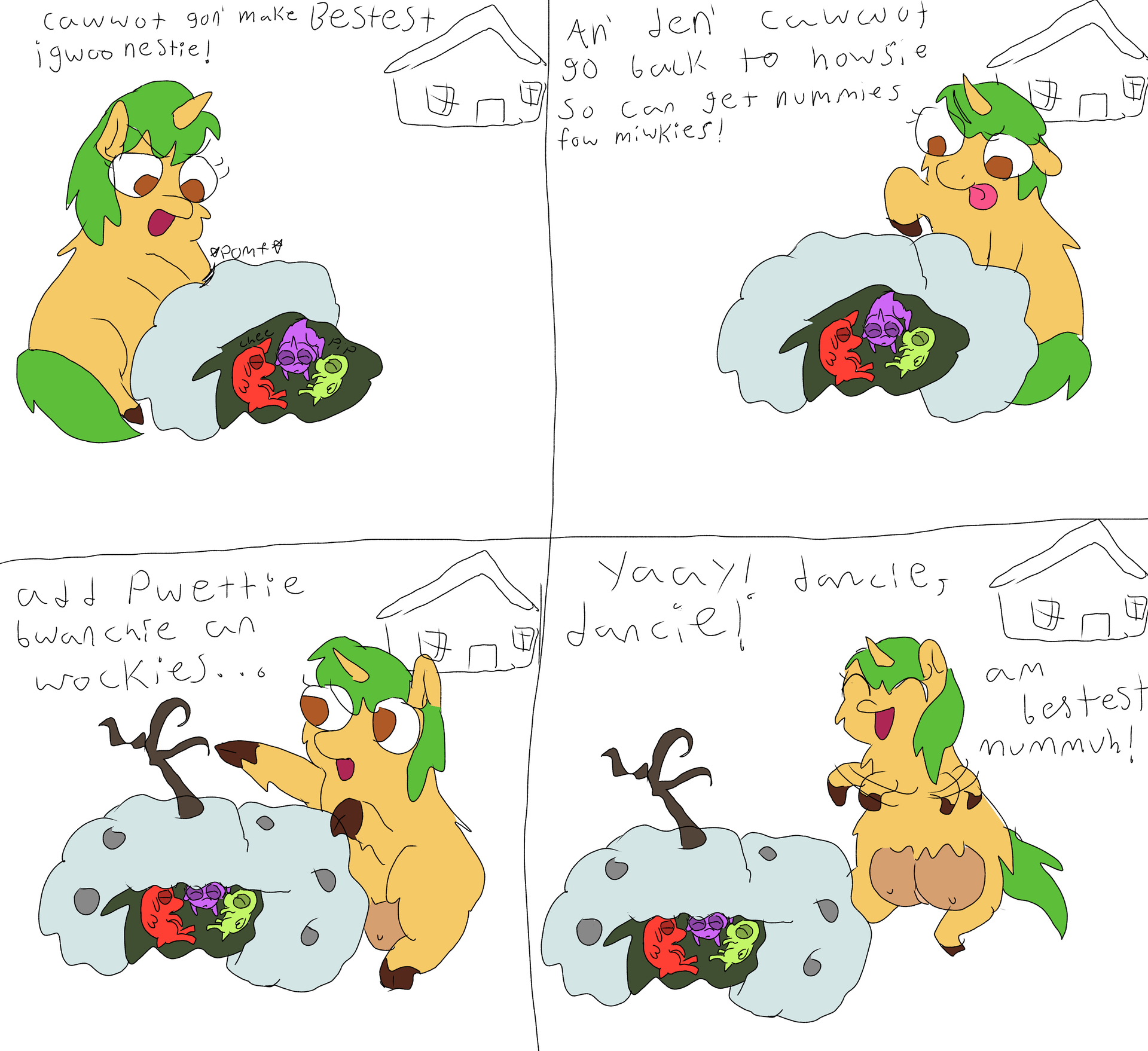 I love the way you drew her dumbass expressions, the tongue hanging out, her DANCING, god, I hope her udders get frostbite