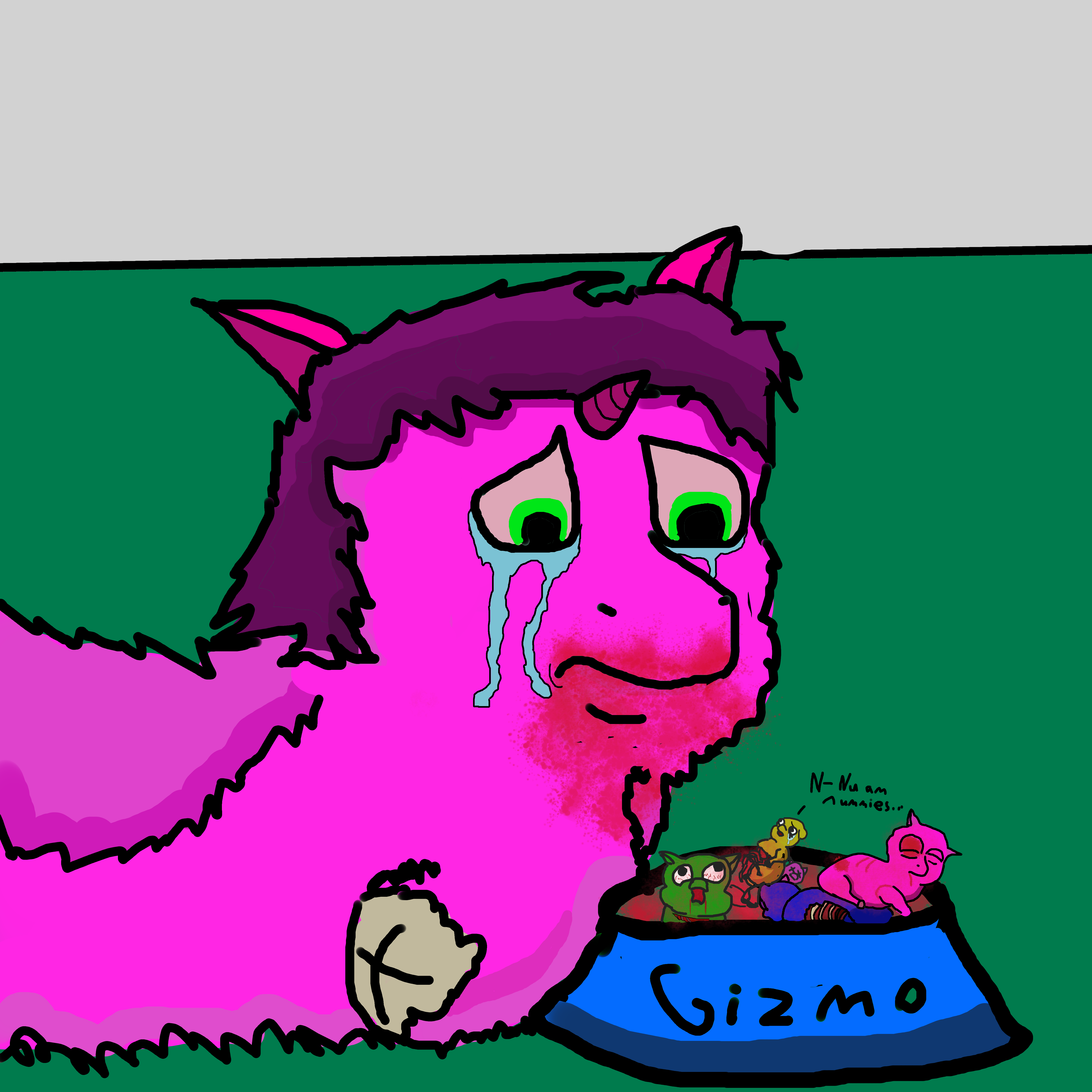 Gizmo was told to never have babies with another fluffy, as he is a very rare and very expensive breed. Any of his offspring would deprecate his own value on the market. Of course, Gizmo ignored this instruction, and impregnated the first mare he saw. Luckily, his owner caught onto it, and after a bit of rapid restructuring of the mare’s spine, he was able to get ahold of the prized “Babbehs”. Gizmo cried and pleaded and screamed all the way up until his owner amputated his legs, ensuring he would never impregnate another fluffy again. As a final insult, his owner, who had already tortured Gizmo’s babies thoroughly, dumped them in his food bowl, saying “This is all your gonna eat for the rest of the week. What did we learn?” But Gizmo did not respond. He couldn’t believe his daddeh, who had raised him since he was a foal, would do such horrible things to his special friend and his children.