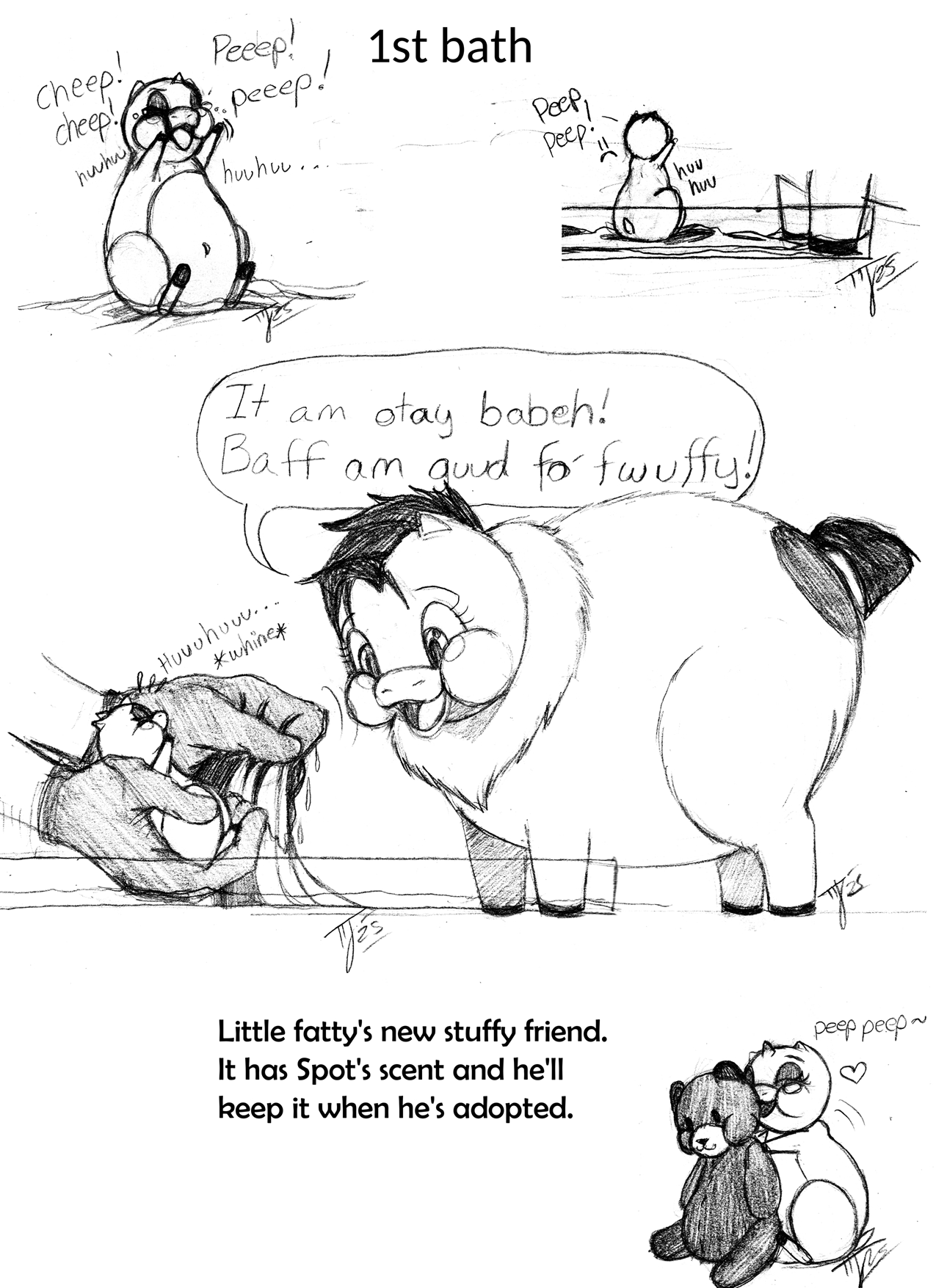 “With Spot’s help, I teach every foal that I wean to not be scared of water. It’s too much to expect my cat and Spot to constantly be cleaning a chirpy, so I use baby wipes throughout the day and one bath daily. The water is lukewarm and very shallow with a cloth on the bottom for traction. I NEVER leave a chirpy unattended in a bath.”