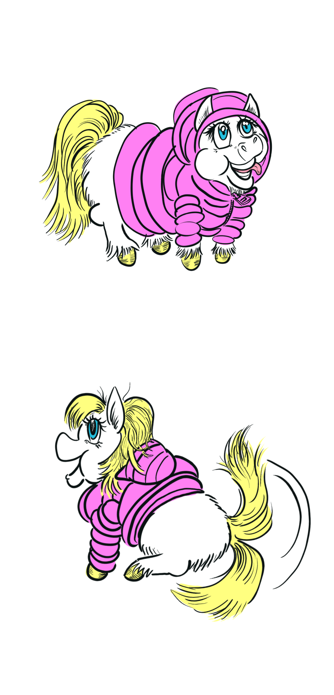 Writhing side to side, Luna shook her head. “Nuuu! Nuuuu! Dun wan cowt! Hab fwuff!” Valerie was determined though and got the article of clothing onto her mare, who know looked like a puffy pink marshmallow.