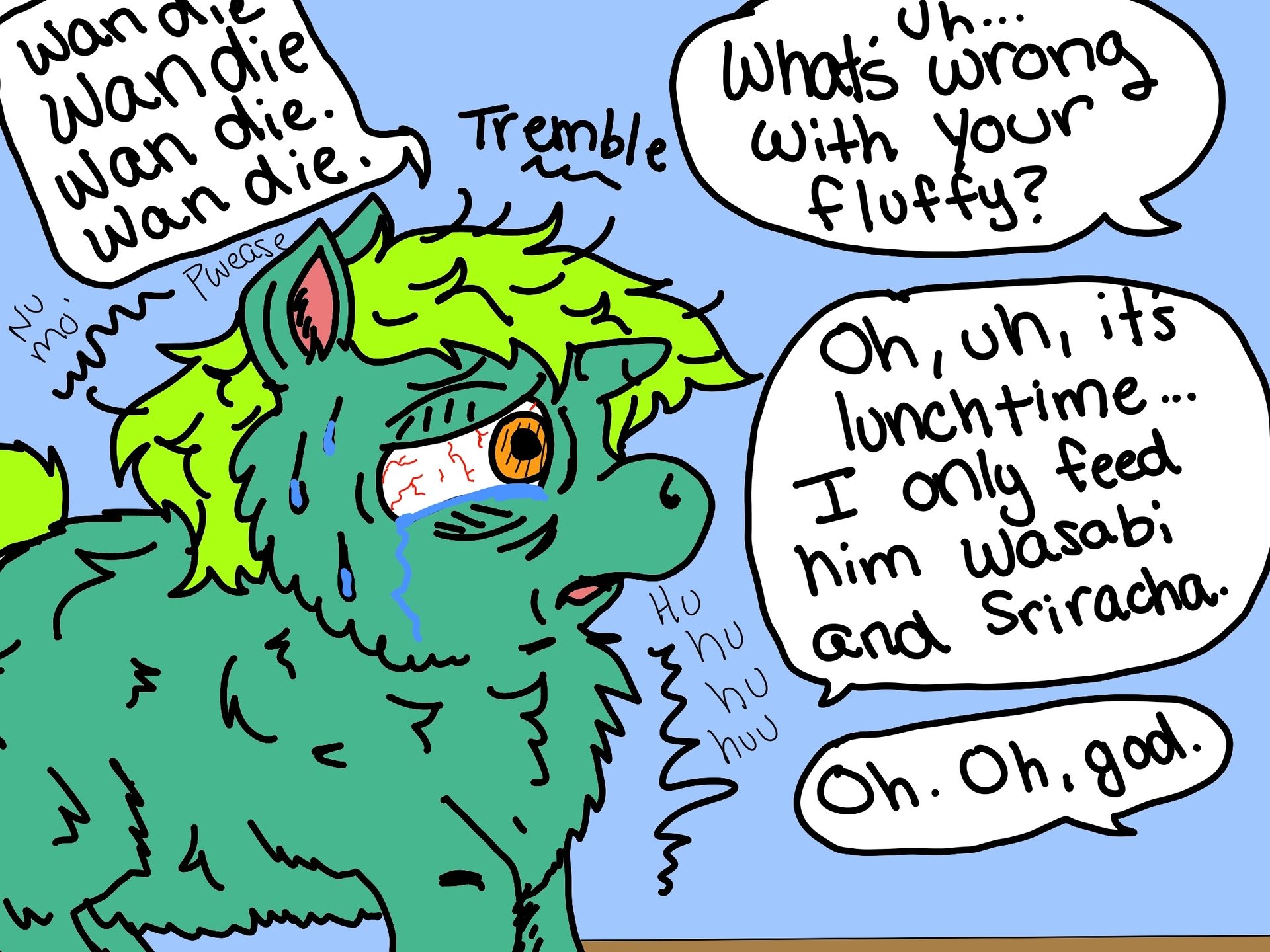 Those two are spicy things, right? That’s just torture, dude. Fluffy needs milk and ice cream to help soothe his tongue (and a stuffed animal or cozy blanket for comfort)