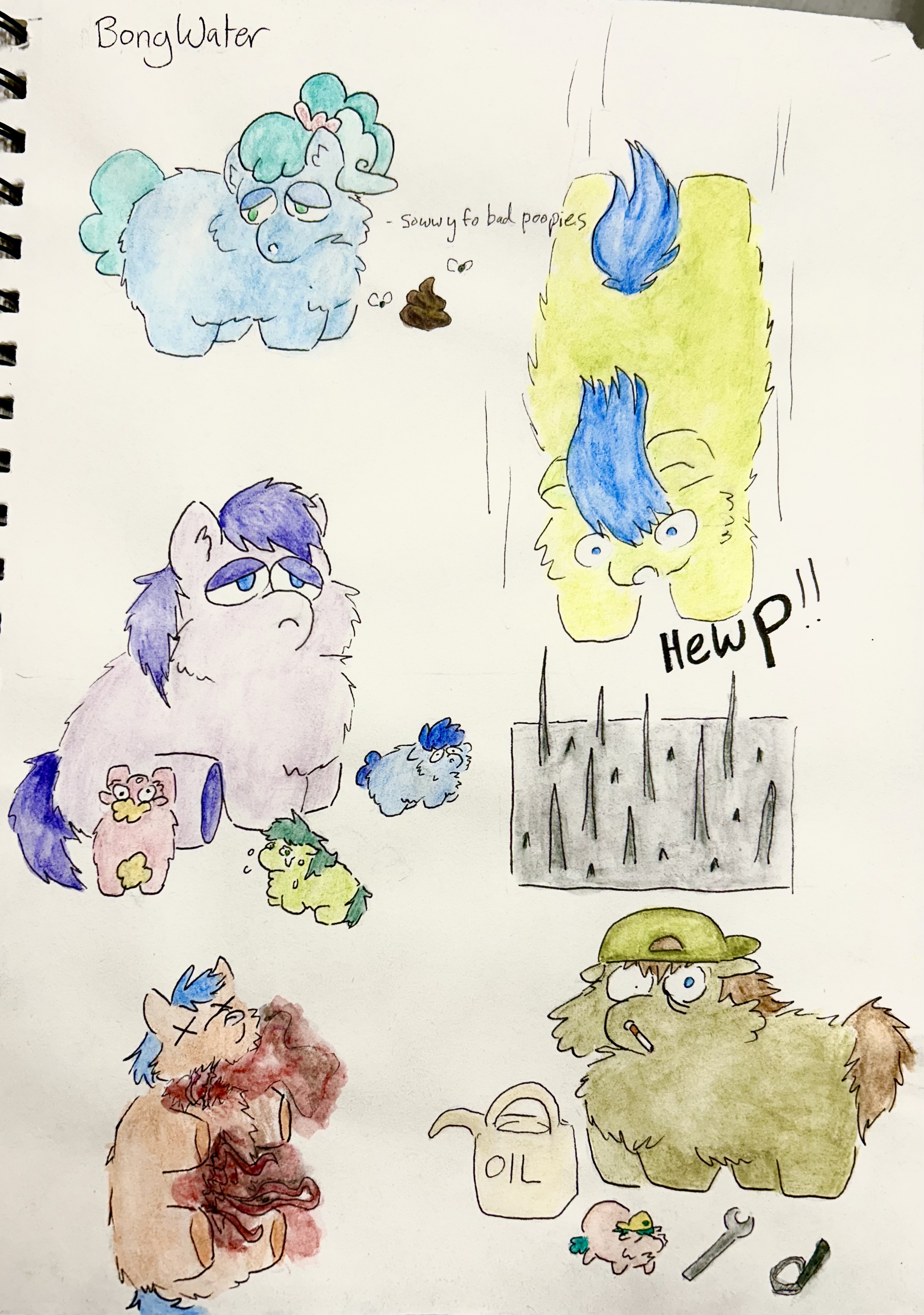 Those two mares look so depressed. I would too if I had to deal with a bunch of dumb babies, OR bad poopies. Yo, can I get greasemonkey fluffy to check my battery connections? I’ll pay him in spaghetti