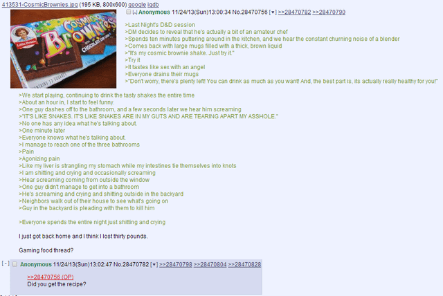“Ppfft who needs mares milk and special formula I’ll just give him a cosmic brownie milkshake. It’s got milk in the name. So it will work right?” Despite numerous people complaining about it giving them the violent shits. Still expecting the SBS to not have explosive diarrhea after removing the diaper. What a dummy