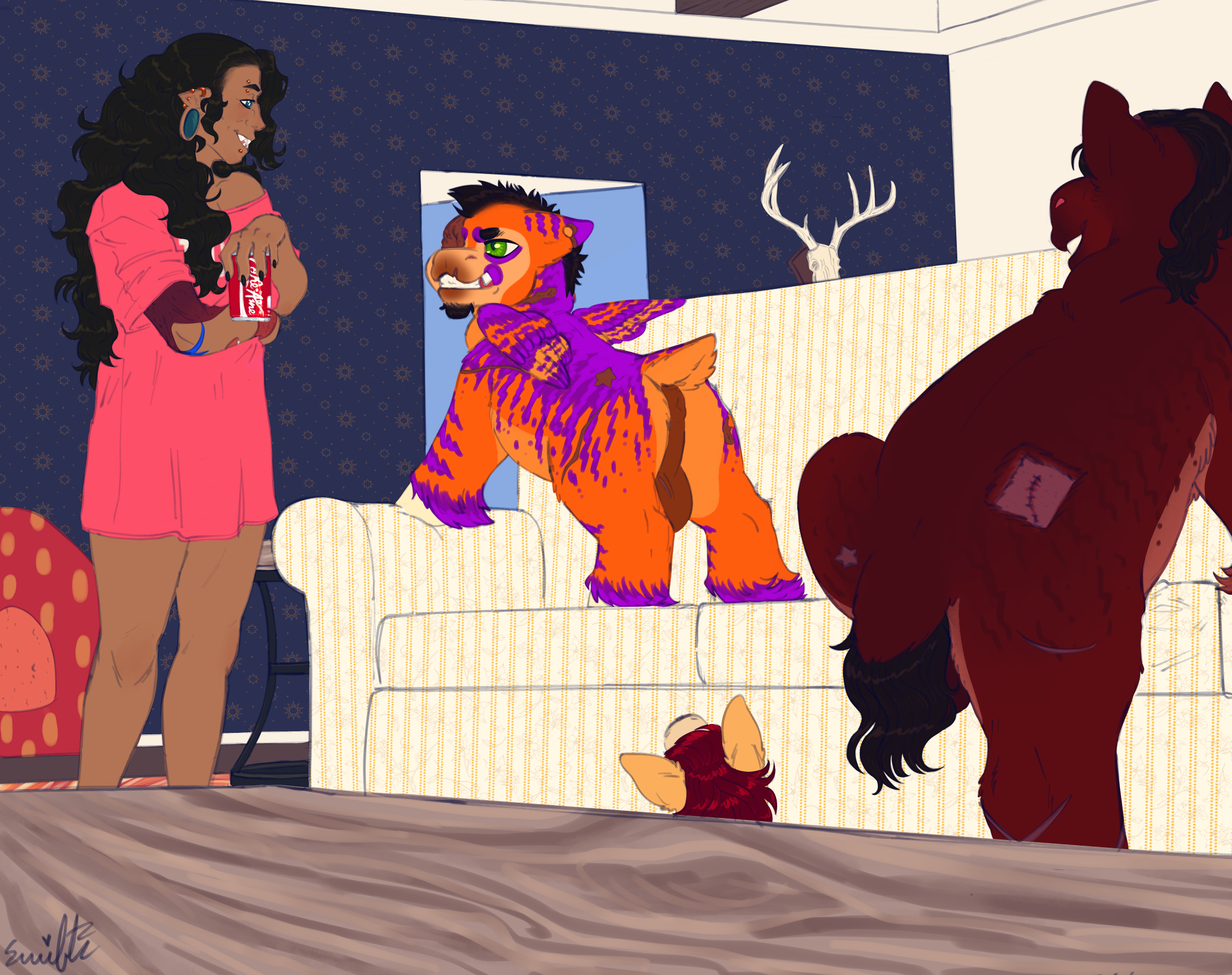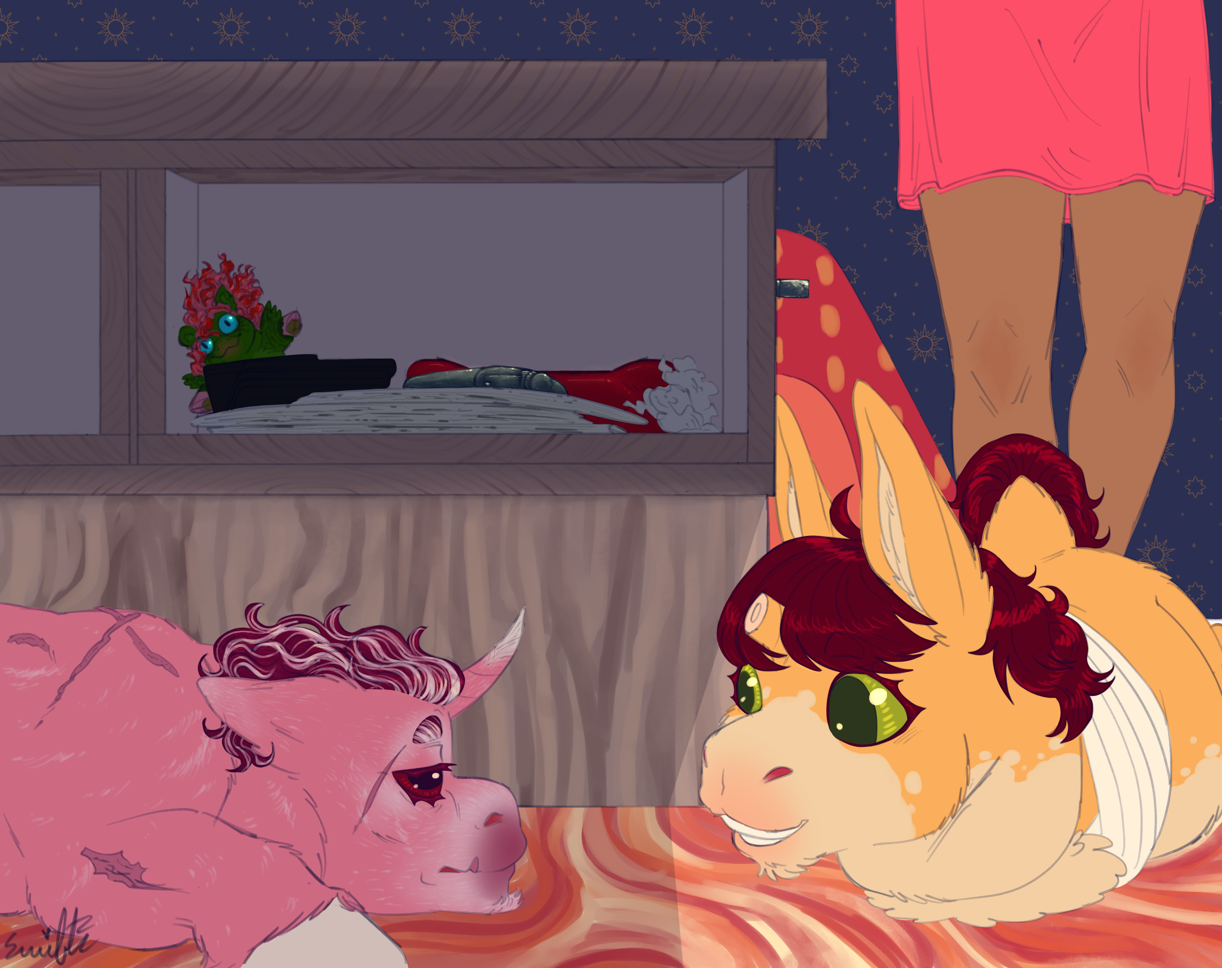 He’d lean in, peering into the darkened space beneath, until he was nearly snout to snout with the other fluffy splayed out under the furniture. Her dark red eyes matched the purplish red mane that was brushed back across her neck and, just like the others, scars dotted her pelt. The horn protruding from her forehead had been ground into a sharp point, revealing pale keratin beneath pale pink velvet.