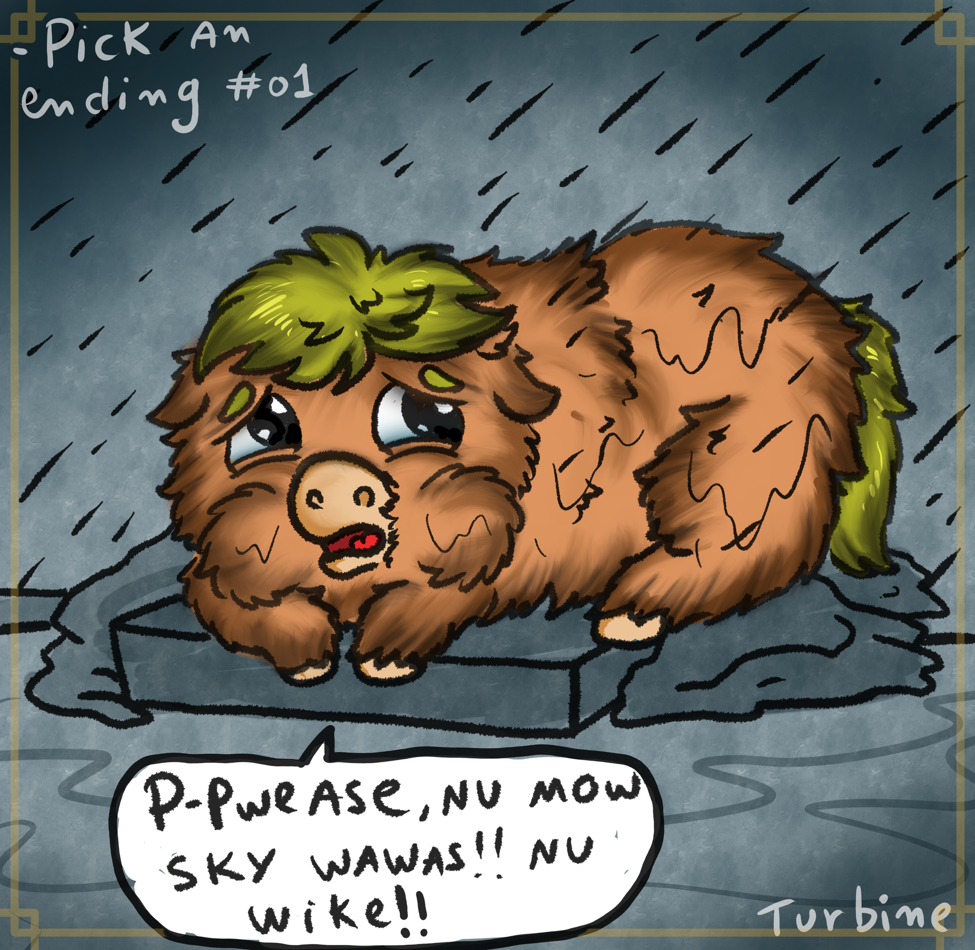This fluffy was left behind by its family, after his mother told him not to eat all the “nummehs” his mummah" was able to find. He took the chance to eat it all while everyone was sleeping and his brother died of hunger. His mother left with a colored stallion and you’re left not alone, but with company: you and your greed.