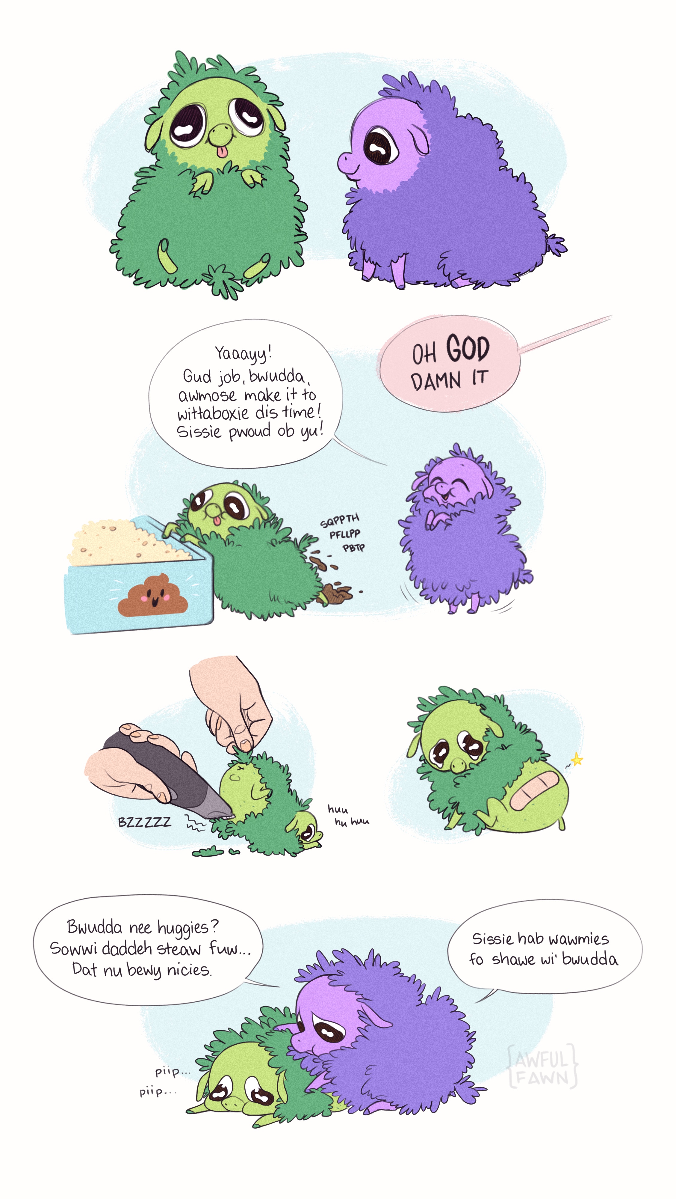 Decided to try to my hand at drawing a pillowfluff. I can picture really rich people having gorgeous, well-bred fluffs as decorative pets that have the pillowing surgery before their eyes open. Then off course they’d buy the fancy “stump covers” to hide the scarring and a lovely “no-poopies” plug for when guests are over (to be removed in private by hired staff so the fluffy can relieve itself).