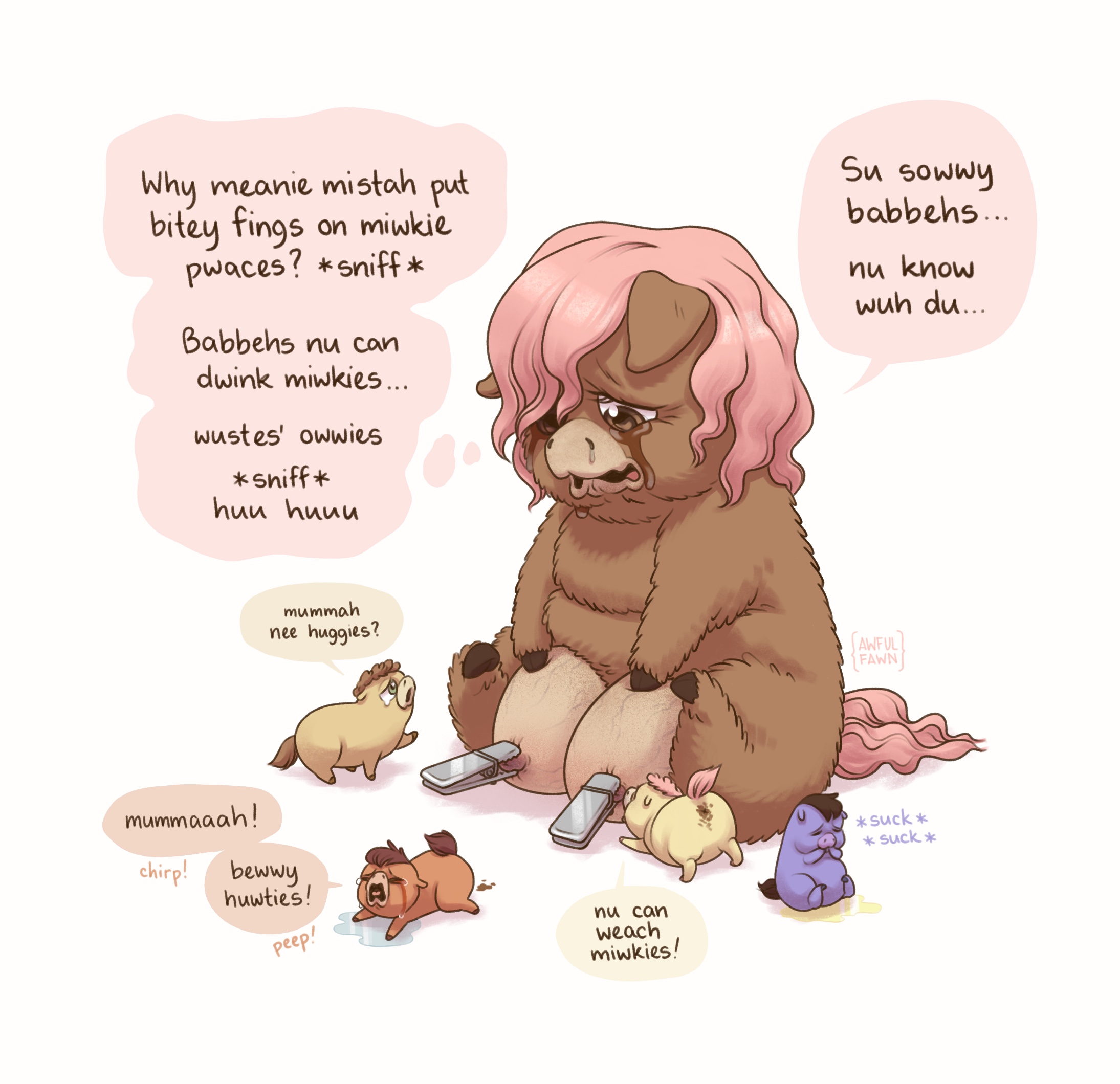 Mare in pain. Bebbehs miserable. Presence of a hoof suckling retard. Good, good, everything is in order.