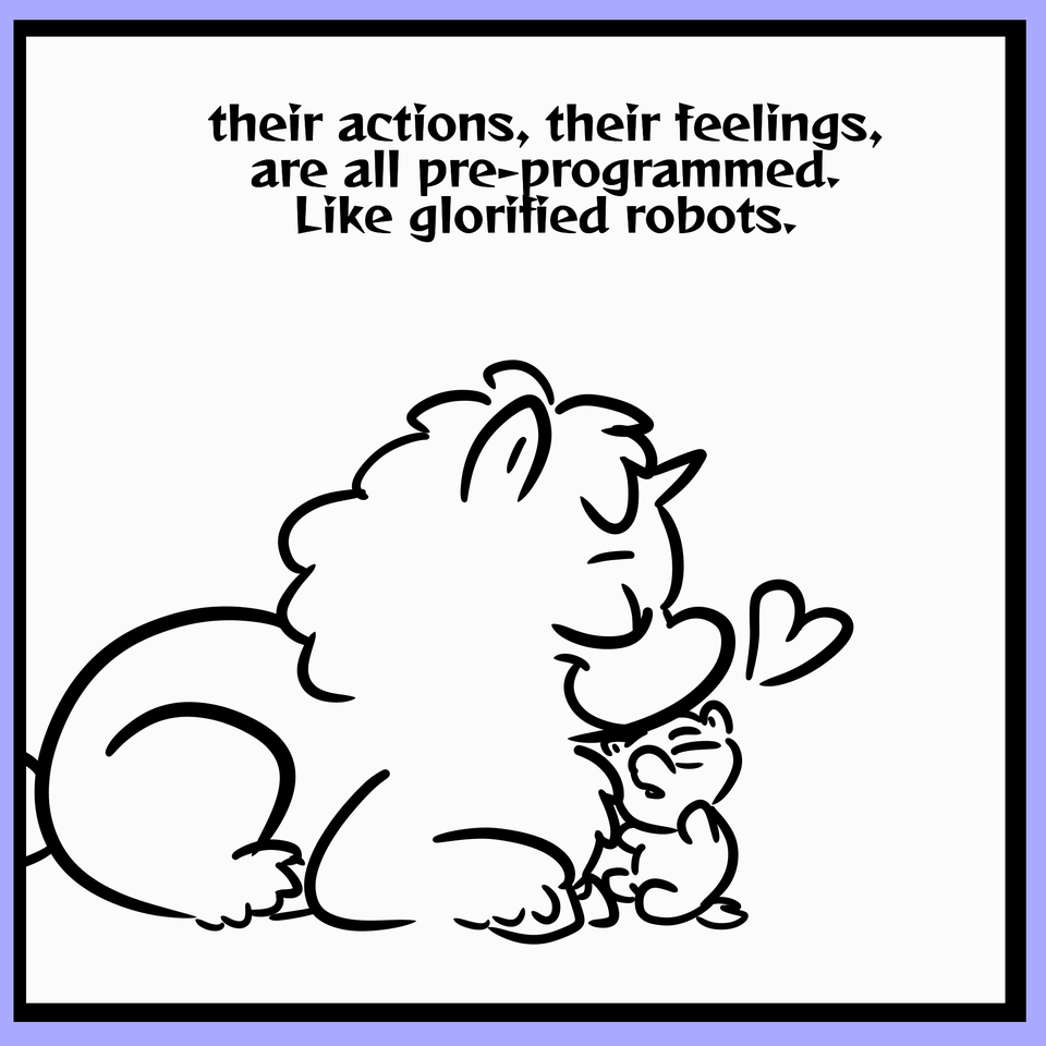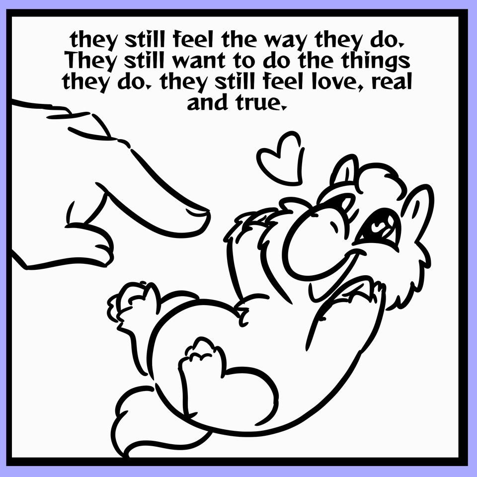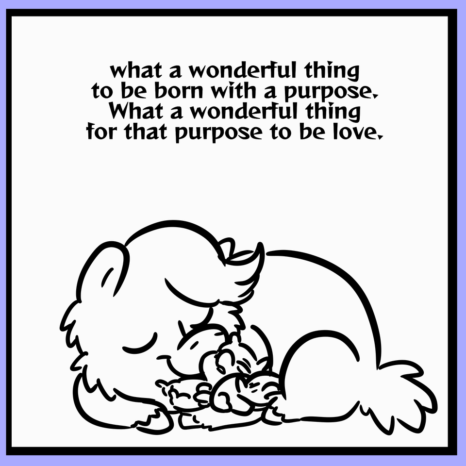 Most Fluffy work depicts Foals and first-time parents. They can breed within like three months usually, which means most Fluffies in most stories are basically running purely on their programming rather than actual life experience. I’m gonna explore that in my mad science series, have some Fluffies who’s programming was deleted other than language grow alongside others who are still programmed.