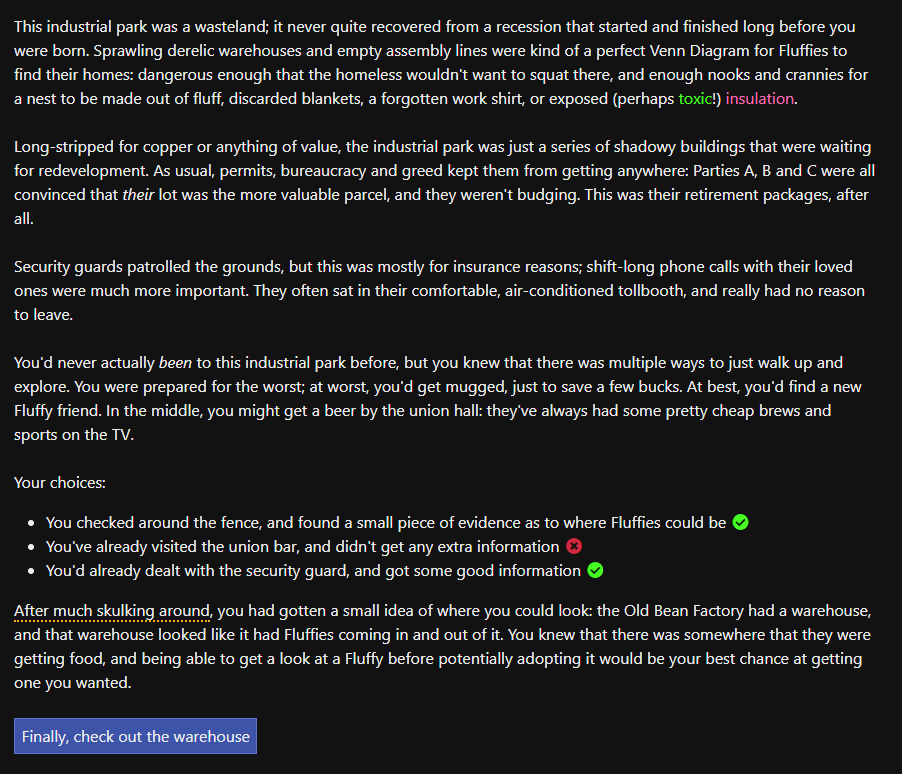 Each have their own caveats; basically I want them to feel different in terms of how they develop, and not just be a different coat of paint on the same mechanics. Today was improving the City route a lot, with a couple branching paths leading to rolls which check as to whether a player succeeds; the more successes, the more “rolls” they have with trying to find a Fluffy, similarly to the Forest scenario. I figure if the player isn’t going to pay for a Fluffy in the forest or city, there’s going to be failure possibilities. The shelter and Fluffmart are for people who don’t want to take risks.