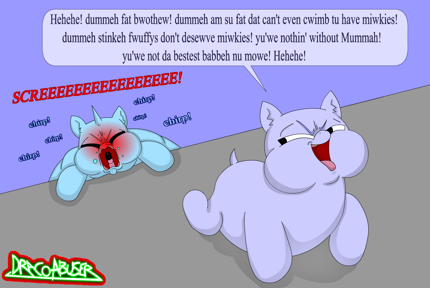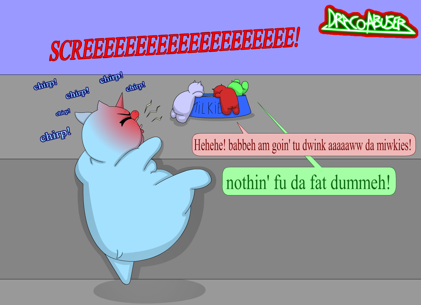 Let him cry and scream as he watches the kitteh munsta babbehs get miwkies while he goes hungry.