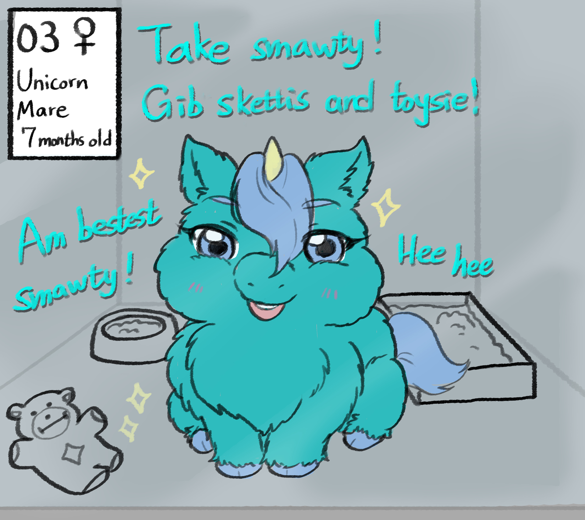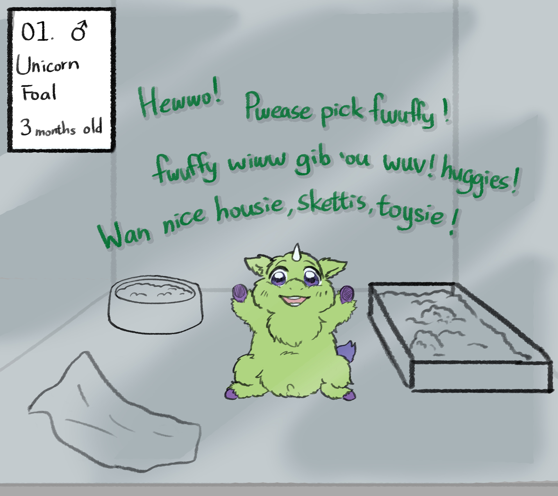Her genetics were quite good; even the color of her horn wasn’t the usual white. However, she introduced herself as a ‘Smawty’… You’d heard that these Fluffies had bad temperaments. At seven months old, she was approaching adulthood for a Fluffy, making it hard to curb bad behaviors.