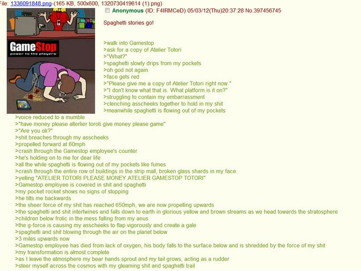 In days of yore (4chan era) it was common to end greentext stories with “spaghetti falling out of your pockets” when the result of the story was shame, anxiety, or embarrassment. For instance: