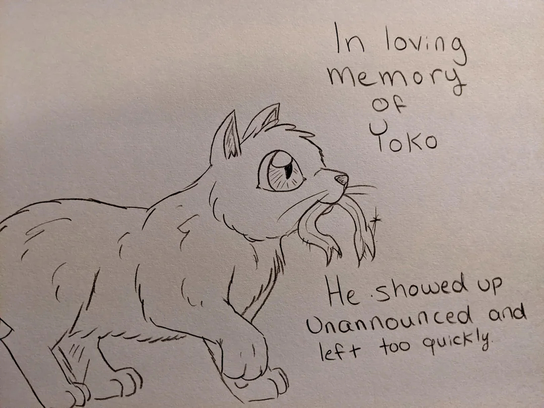 They were feral and unfriendly at first. Yoko’s brother died seemingly randomly not long after we brought them in. They’d been so thin we thought he’d just gotten too weak even though we’d tried feeding them constantly. Yoko lived to adulthood and was an amazing cat. He’d wait in the window until I parked and would run to the door with his favorite ribbon in his mouth.