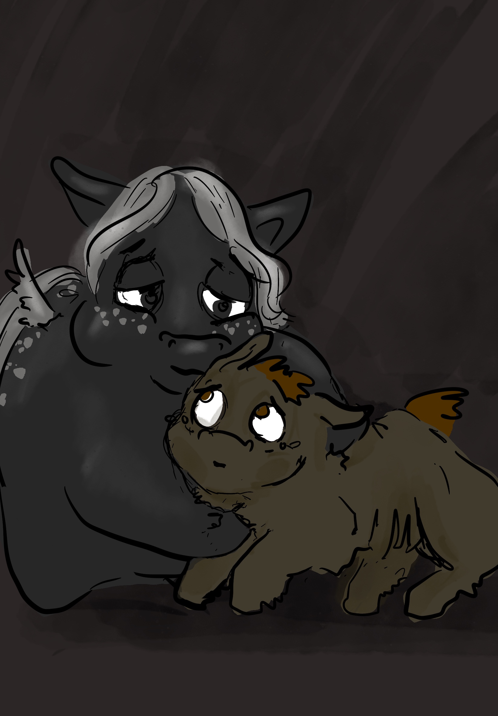 The two toughies stopped to catch their breath. Even hauling a frail, sickly poop eater was a lot of work for a fluffy pony.