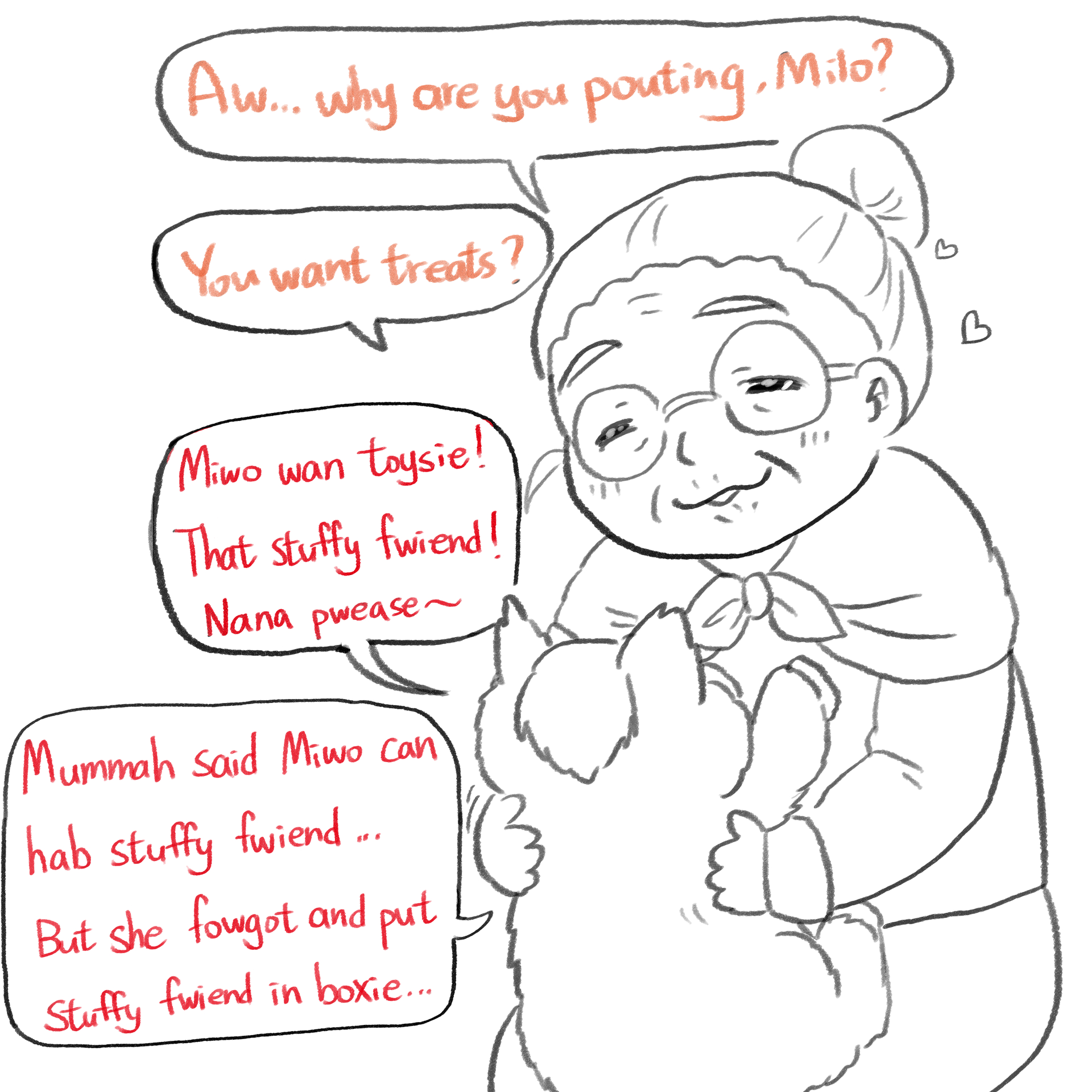 Milo’s in for a Wide World of Hurt. I love his enraged pouting face, it’s so real. Nana’s got a heart of gold, she can’t be blamed