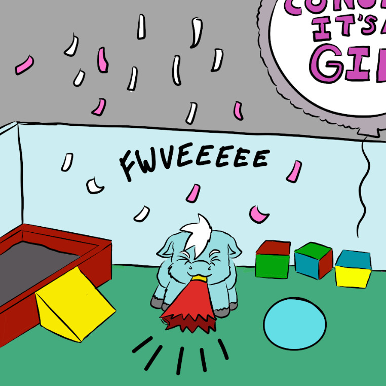 A burst of confetti hit his face as a tiny foal blew a party streamer with a jaunty pffvvvvv. Balloons labeled, “It’s a girl!” and “Congratulations!” streamed out and up into his ceiling , “Hewwo daddeh! Ams yuh bestest mostest bwavest fwuffy! Namesies ams Zippy!” The lavender purple unicorn was staring up at him with adoring blue eyes. He glared back with a look of complete contempt.