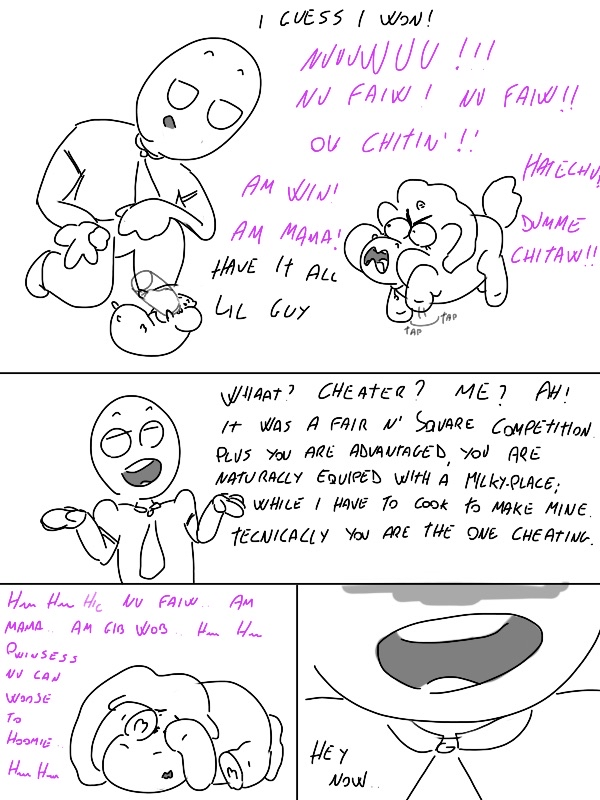I love the baby. Lil guy looks like he should be stupid as fuck, but the fact that he’s trying to follow instructions and rub his few brain cells together to spark what he needs to properly judge the miwkies means he’s actually much more of an