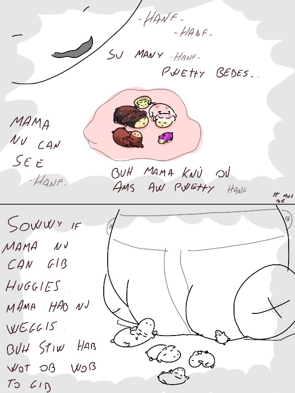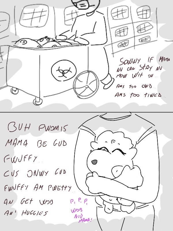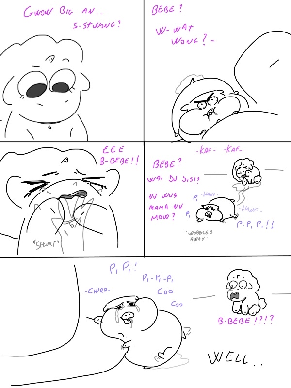 Initially I thought the mama got milkbagged and was talking to her future offspring in the panels but I guess she was remembering her own mama in the mill, who was milkbagged and tried in vain to teach her how to be a good fluffy. Will it stick, I wonder?