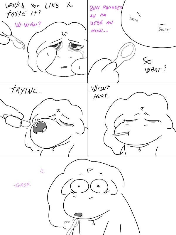 Your art makes me want to draw more SBS fluffies and then even fatter and more pathetic than what I’ve done so far, especially his cheek being squished by the spoon.