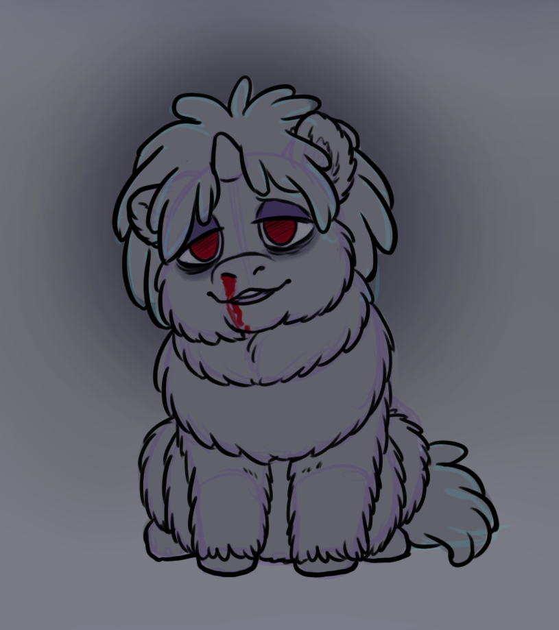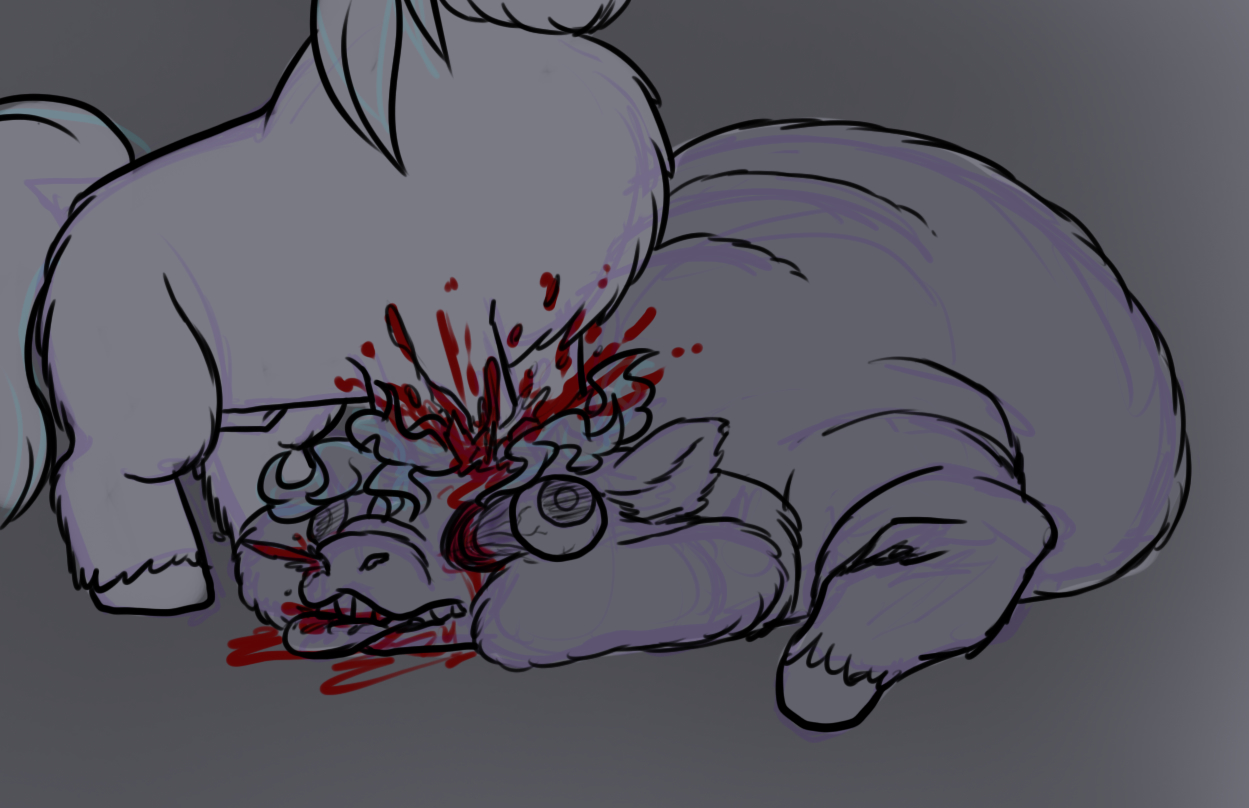 Your brother stomps up, following orders as he slams his hooves into the elder smartyâs face. Despite the large mound that made up the bigger smarty, he barely moves his body. Perhaps too fat to retaliate? Your brother gives another mighty stomp, pinning the elderâs head to the ground as he coughs. Boo-boo juice pouring from his muzzle. With one more stomp, the elderâs head caves in. His eyes popping out as blood sprays with the crunch of bone. The elderâs body convulses in itâs death throws. The surrounding fluffies cry and whimper, yet they donât fight back.