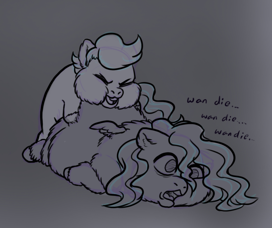 The pegasus doesnât move, she doesnât even cry. Her face remains slightly turned in the direction of the deceased elder, quietly whispering her name over and over even as your smarty mounts her. For some reason, the instant submission⌠No⌠The lack of reaction, unnerves you.