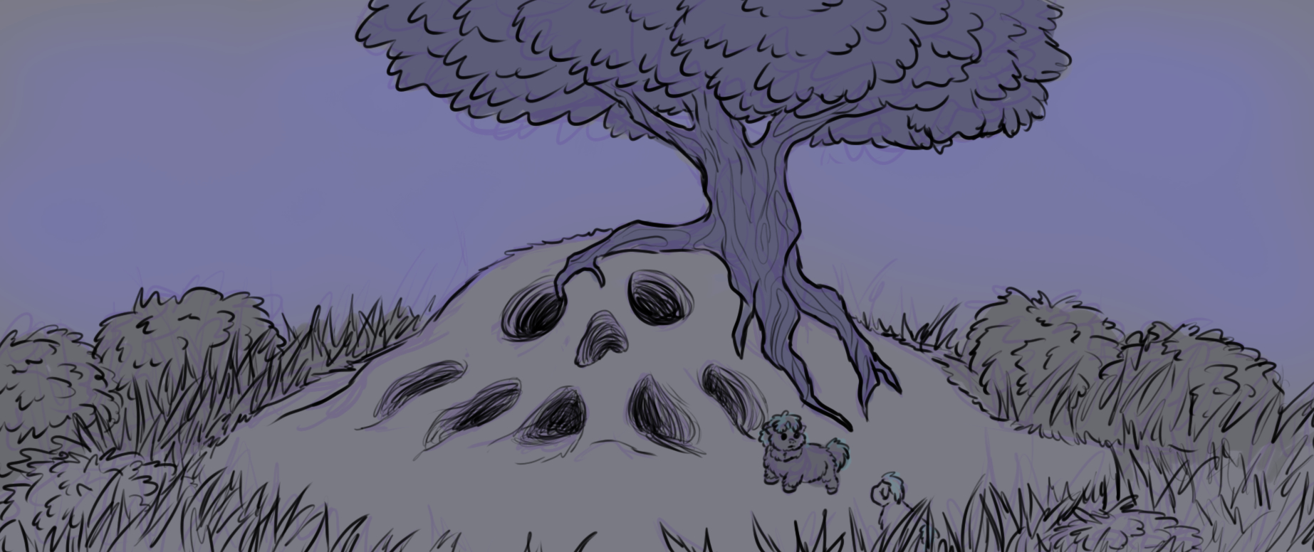 All you could do was follow your smarty through the tall grass in hopes the monsters couldnât see you any more. Before you knew it, you had accidentally run out of the tall grass, into a small clearing with a tree on top of a hill. A fluffy youâve never seen before waves you over from a dug out hole within the hill. Your smarty and your brother waste no time darting into the hole in hopes of sanctuary, and you follow. Once you were safely hidden from the monsters outside, the three of you catch your breath.