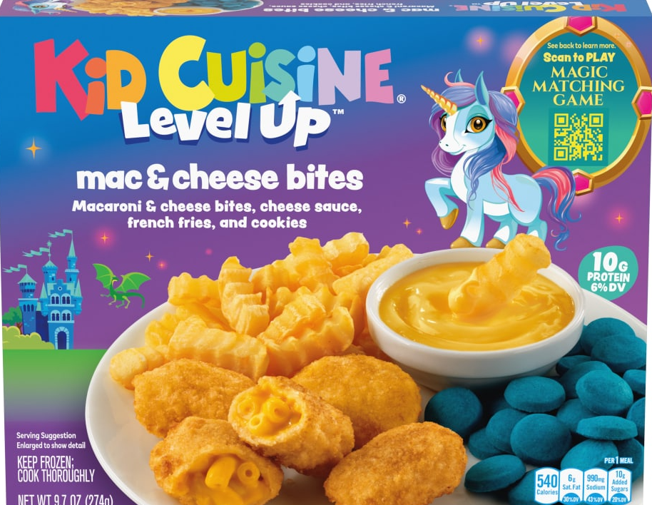 Then something grabbed her attention. Bright blue box. Rainbow colored unicorn with a princess castle. This was a Kid Cuisine Level Up meal! It came with macaroni bites, cheese sauce, french fries, li’l blue cookie things.