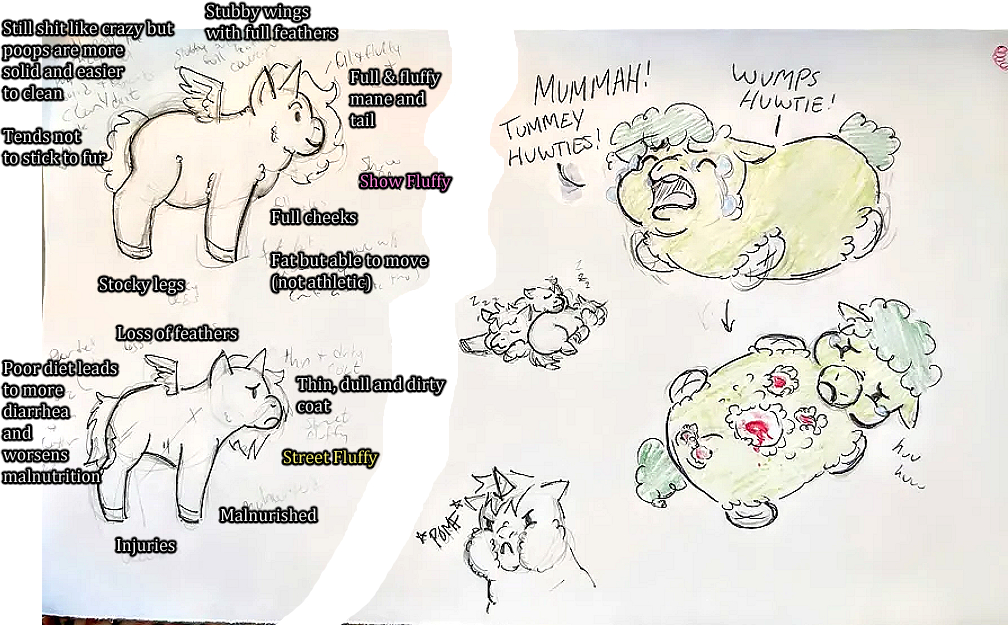 Listen, listen, i am not saying fluffies aren’t shit machines, even the most expensive pedigree fluffy is more poop than animal. What I am saying is if they liquid shit multiple times a day then I cannot believe anyone would willingly keep one as a pet, I just can’t. Therefore I believe with a well-balanced, not trash diet their poops are relatively solid, and don’t instantly adhere to a fluffies fur, especially if their buts are trimmed. That way you don’t have to clean a fluffy each time it poops, and litterboxes are easier to maintain. Feral fluffies that have to eat whatever they can, or spoiled fluffies who pig out on snacks all day have the stereotypical gross and messy shit fluffies are known for. I think the rest of the headcanons are fairly standard.