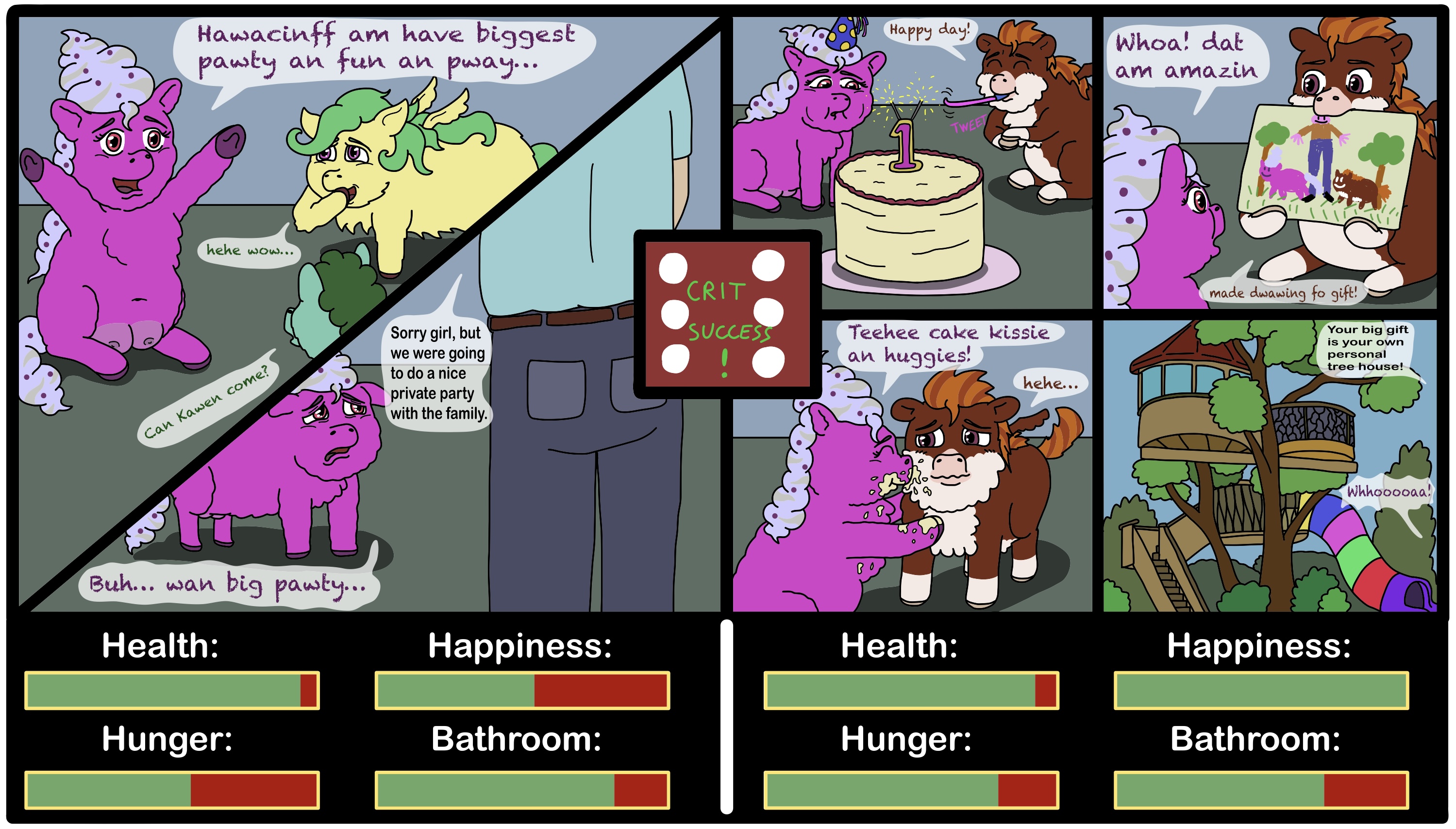 Far be it from you to kill her joy, you decide to take her to the baby shower. You arrive at the house where you are greeted with Fluffy pony themed baby balloons. You go over to the punch and hope that it’s spiked while Hyacinth gallops up the stairs to see the “babbehs”.