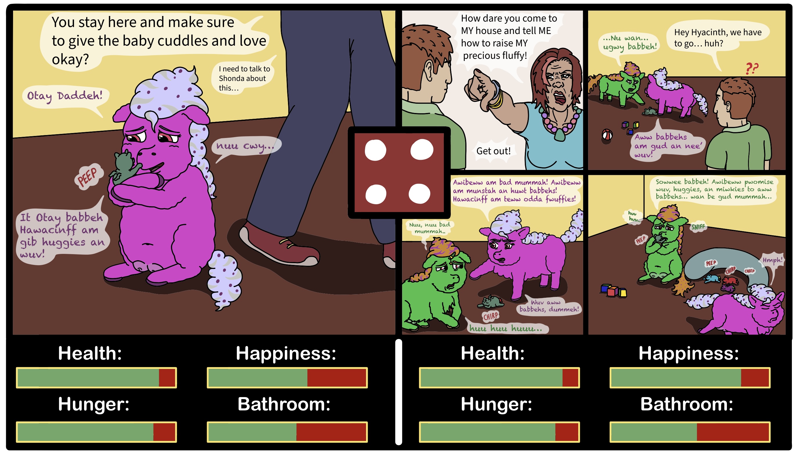 You realize that she’s in one of her “moods” and you will not get anything in edgewise. So you cut your losses and go grab Hyacinth. But as you go up to the safe room, you notice Hyacinth and Aribelle having a heated discussion. You can’t make out what they are saying at first but it is clearly over the foal. Finally Hyacinth snaps and lays into Aribelle hard with a tirade, accusing her of being a “bad mummah” who is going to “huwt aww widdwe babbehs, an no knu how to gib good huggies and wuv to aww babbehs”. Aribelle can’t mutter any defense and is destroyed by Hyacinth’s brutal barrage over her neglect.