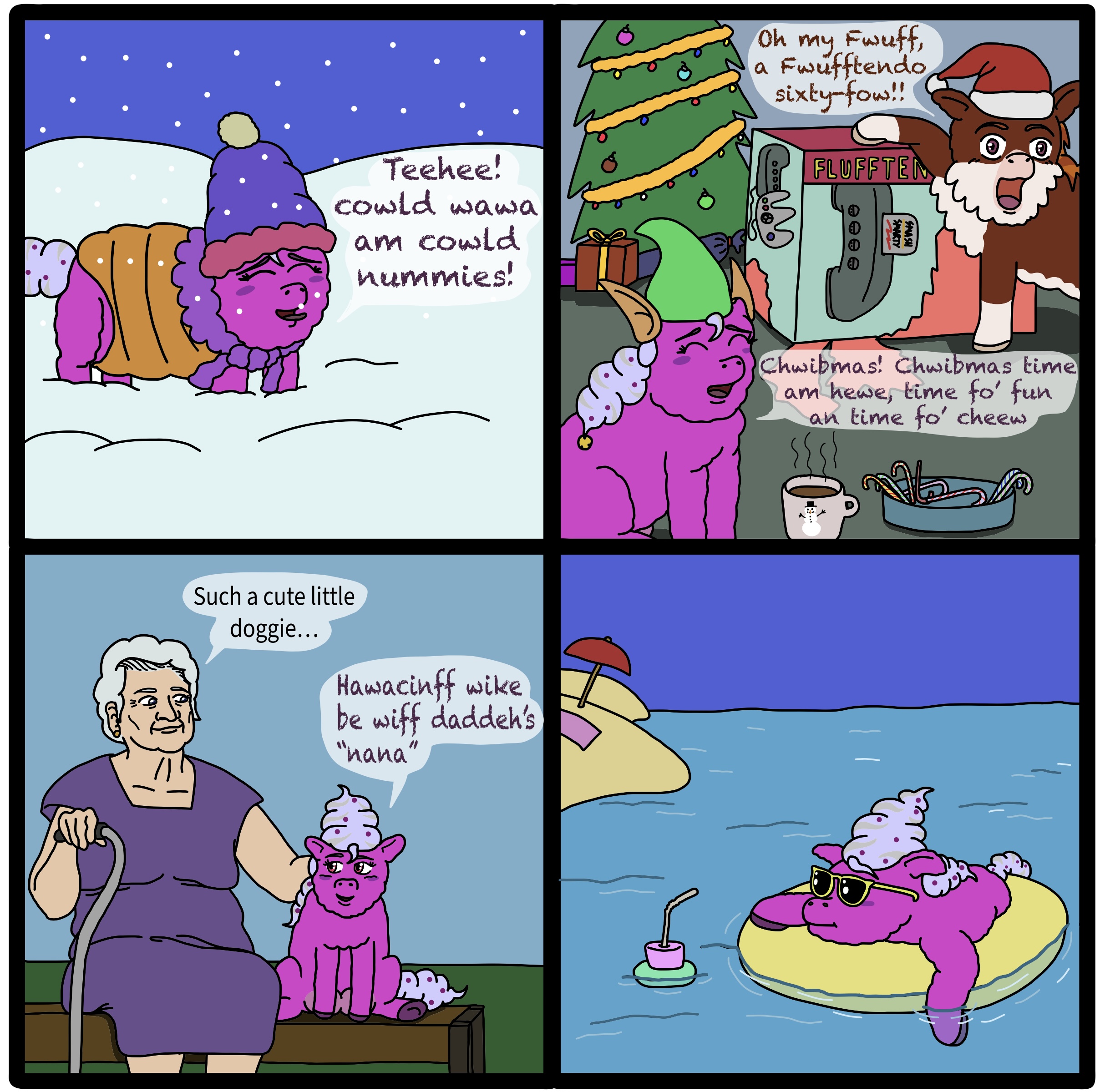 Hyacinth requested a professional “glow-up” called the Dippsy-Dooddle,a chemical process that enhances her colors in addition of styling her mane in a high-fashion that increased her appearance to humans and fluffies. The style is a bit delicate so she has curbed her more rambunctious style of play for a more proper and edified style of play and interaction, she will take her time with things to not mess up any of her “pwettiness”. She is extremely tidy and still enjoys the outside but will stick to paths and well manicured areas.