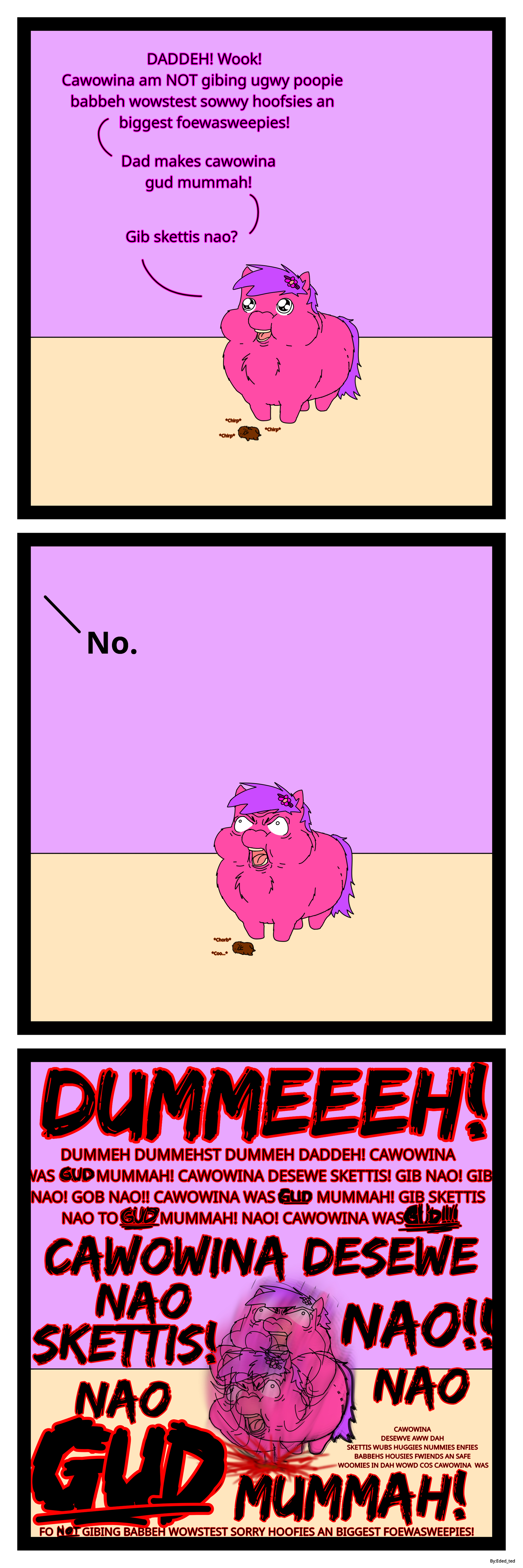 Ehem… May I suggest, prompt humane euthanasia for this rather uncouth Fluffy Pony ™ of hasbio incorporated? No? Very well then… instead how about a lobotomy of the CLEARLY damaged or malformed centers of her brain to remove that most unsightly aggressive and demanding behavior? No to that as well?! Hm… very well then I’m afraid we are left with no recourse but to have her turned into a quote-en-quote “milk bag” or “enfie pal”, or as a VERY last resort properly spayed before being released to the wild to fend for itself whilst being unable to contribute to the out of control feral problem.
